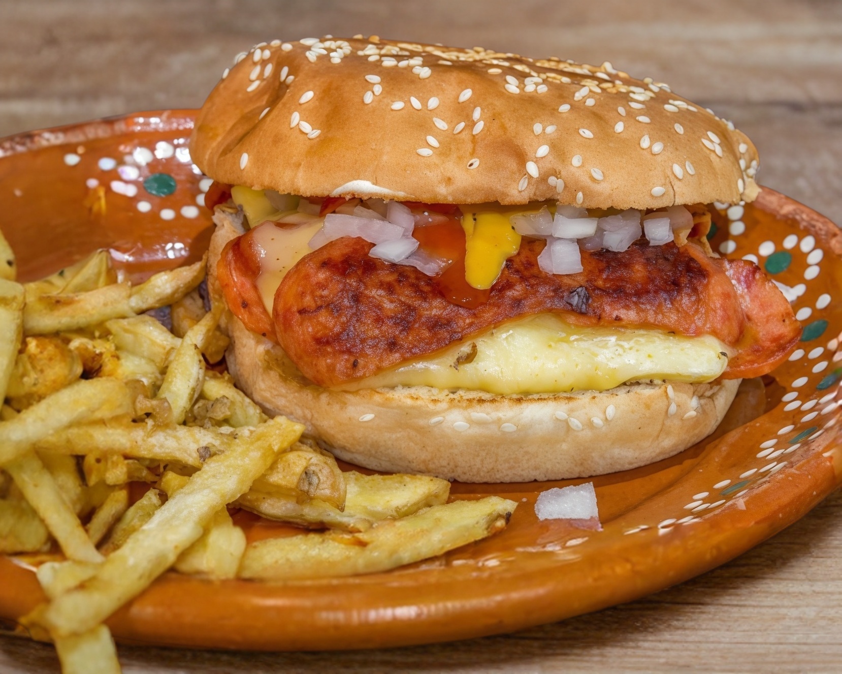 ¡Sabor mexicano puro! carne mezclada con la potencia del chorizo corona y abundante queso asadero fundido. Se complementa con cebolla y jitomate fresco para equilibrar esta bomba de sabor especiado. ¡Pídela si te gusta lo intenso!