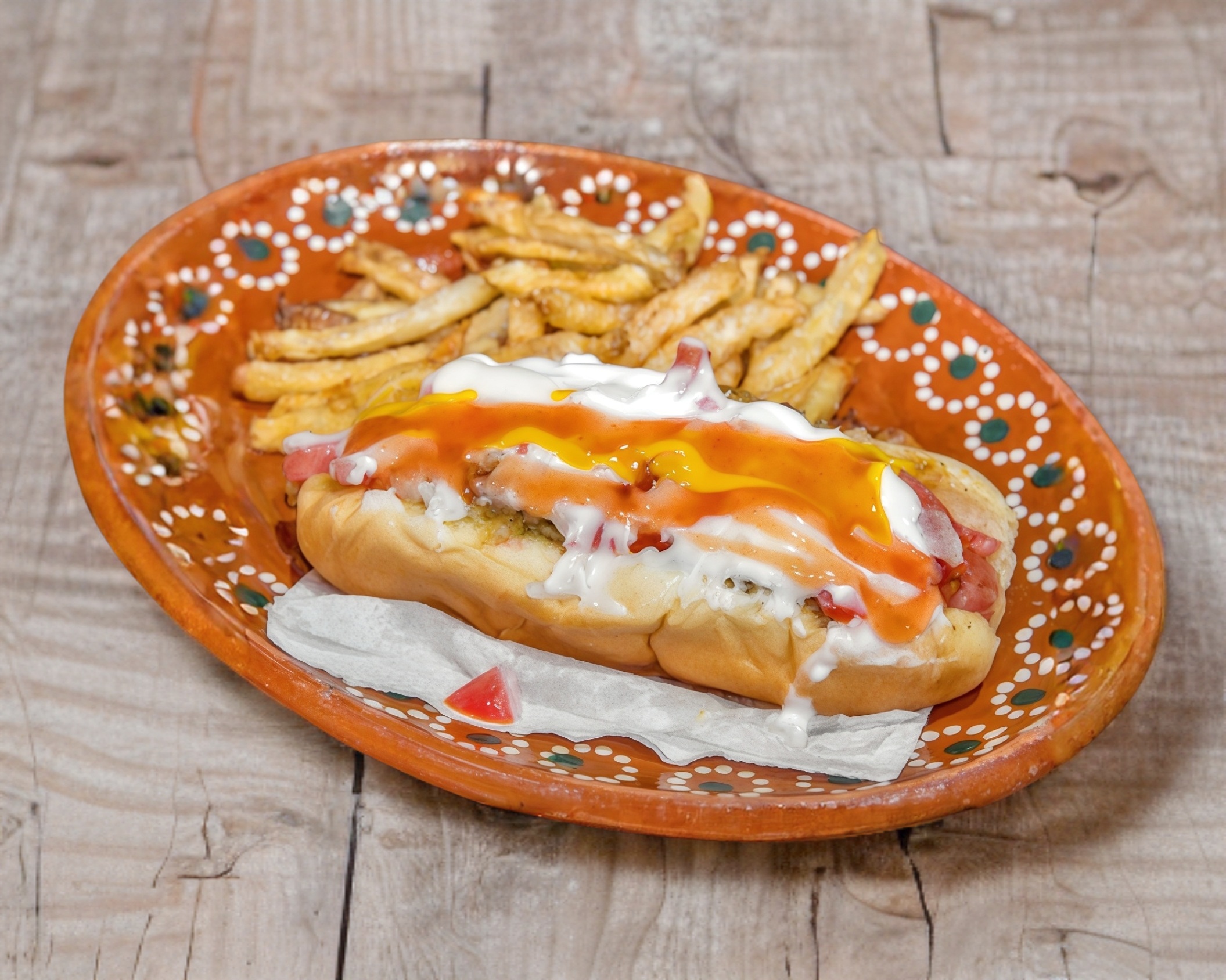 El clásico indispensable. Nuestra deliciosa salchicha envuelta en tocino doradito a la plancha es la base perfecta. Tú decides el toque final con nuestra variedad de salsas a elegir. Sencillo, crujiente y con ese sabor tradicional que te encanta.