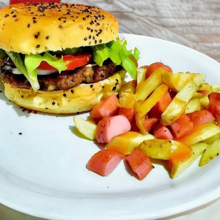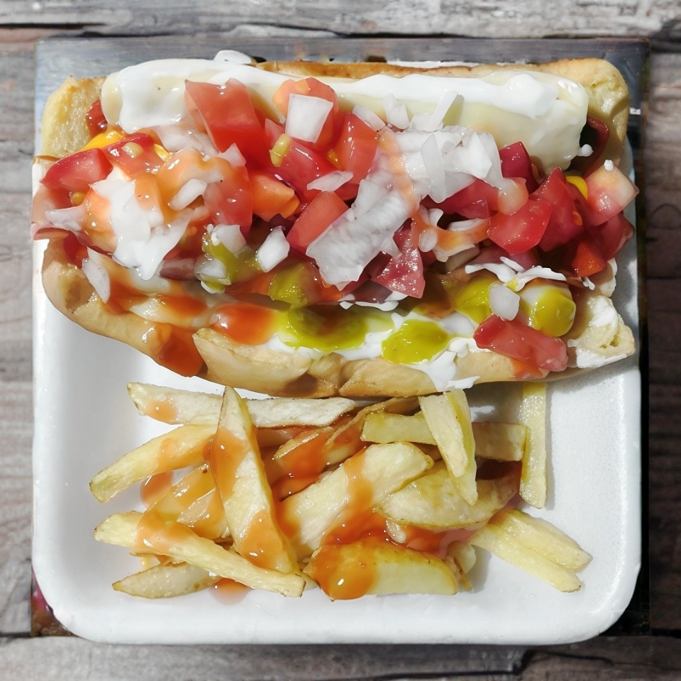 CARNE ESPECIAL DE RES Y QUESO ASADERO. ACOMPAÑADA DE PAPAS Y SALCHICHA. PAN: BIMBOLLO GIGANTE