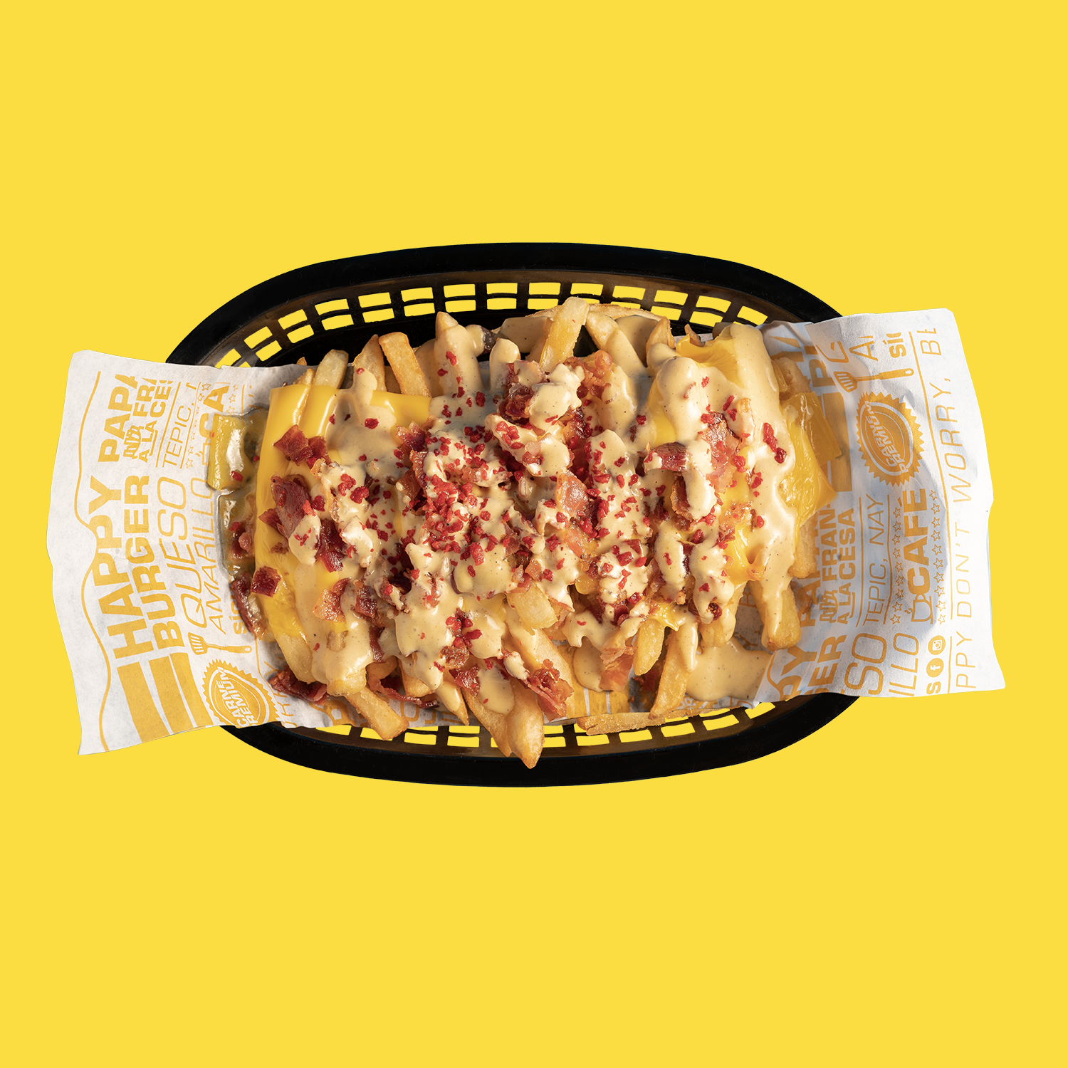 Papas a la francesa, bañadas en queso amarillo con tocino y aderezo happy.