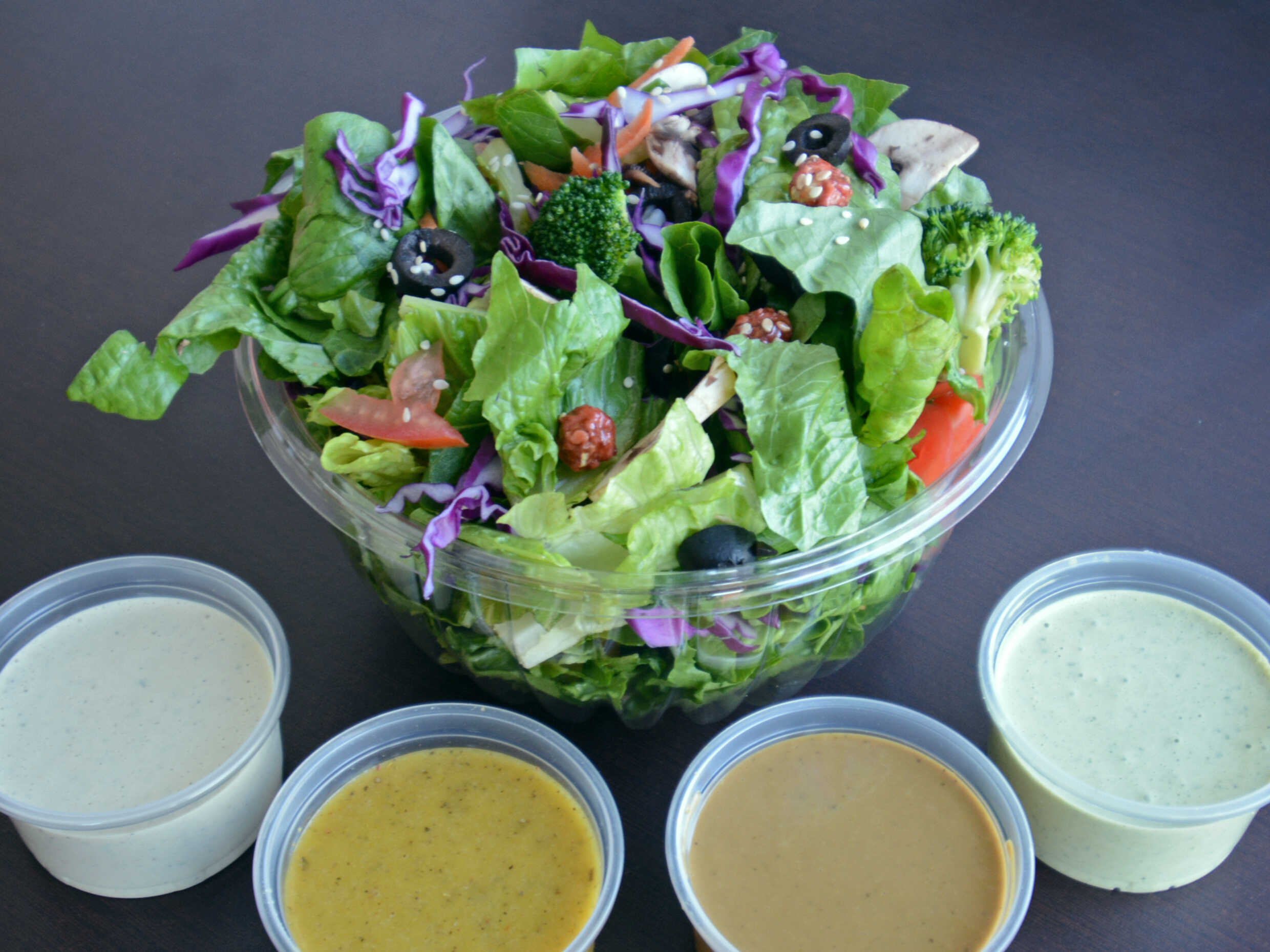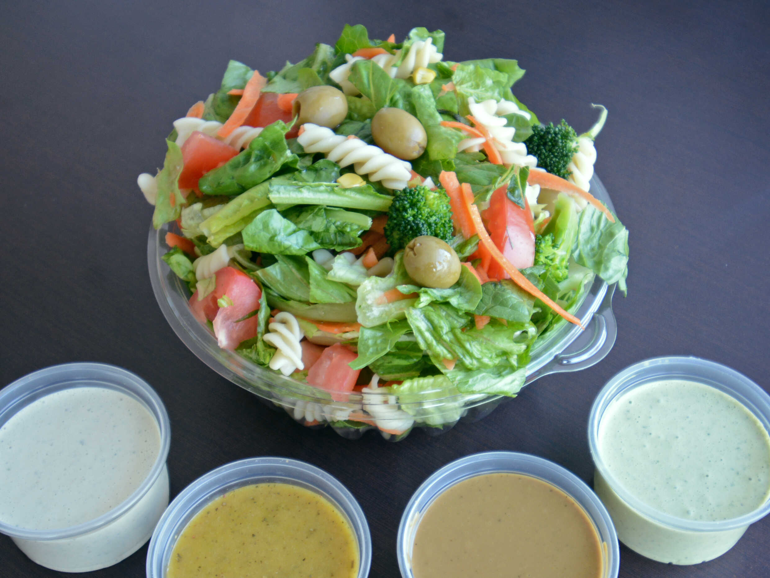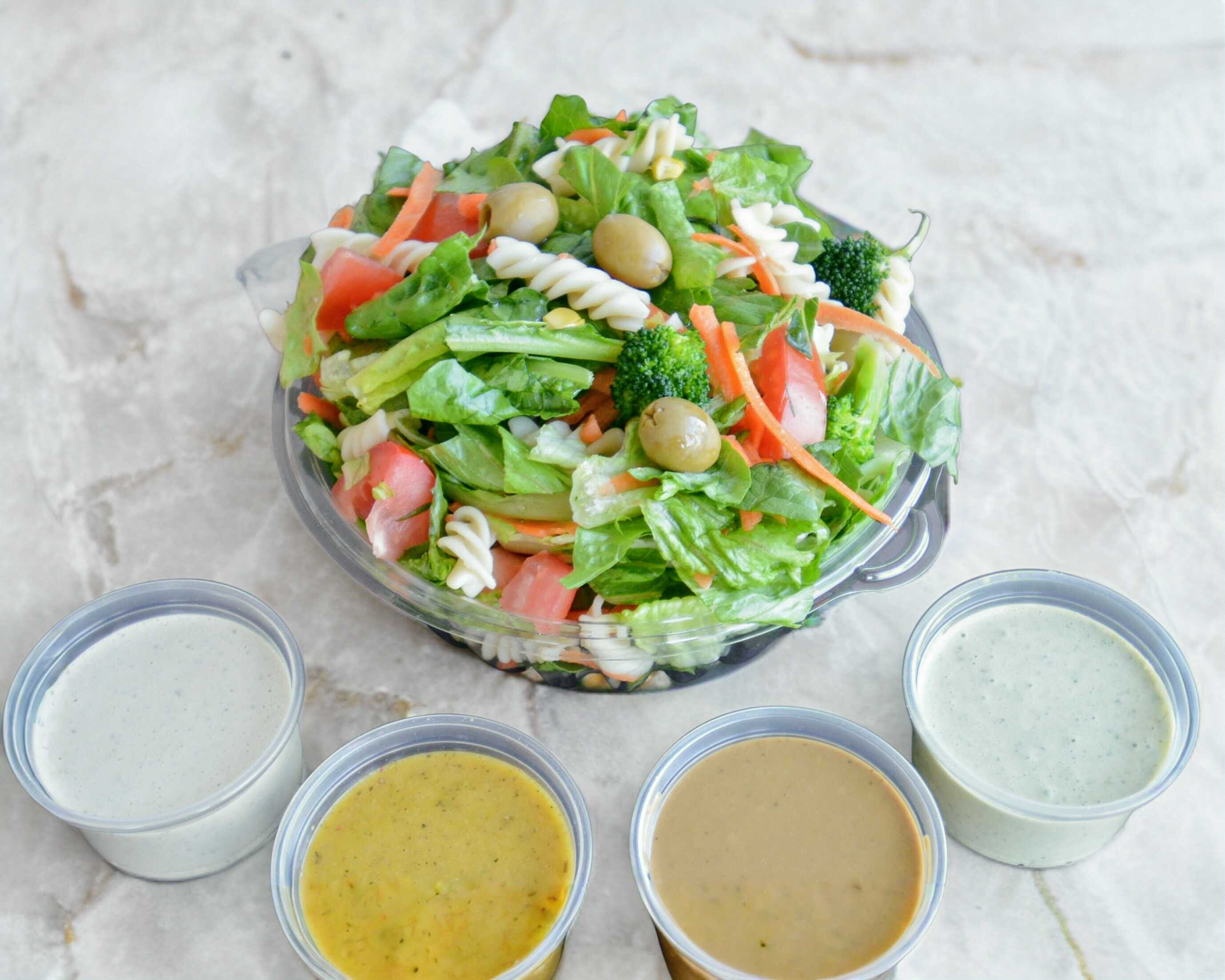 Ensalada a base de lechuga orejona mas 4 ingredientes a elegir, 2 porciones de proteína y aderezos.