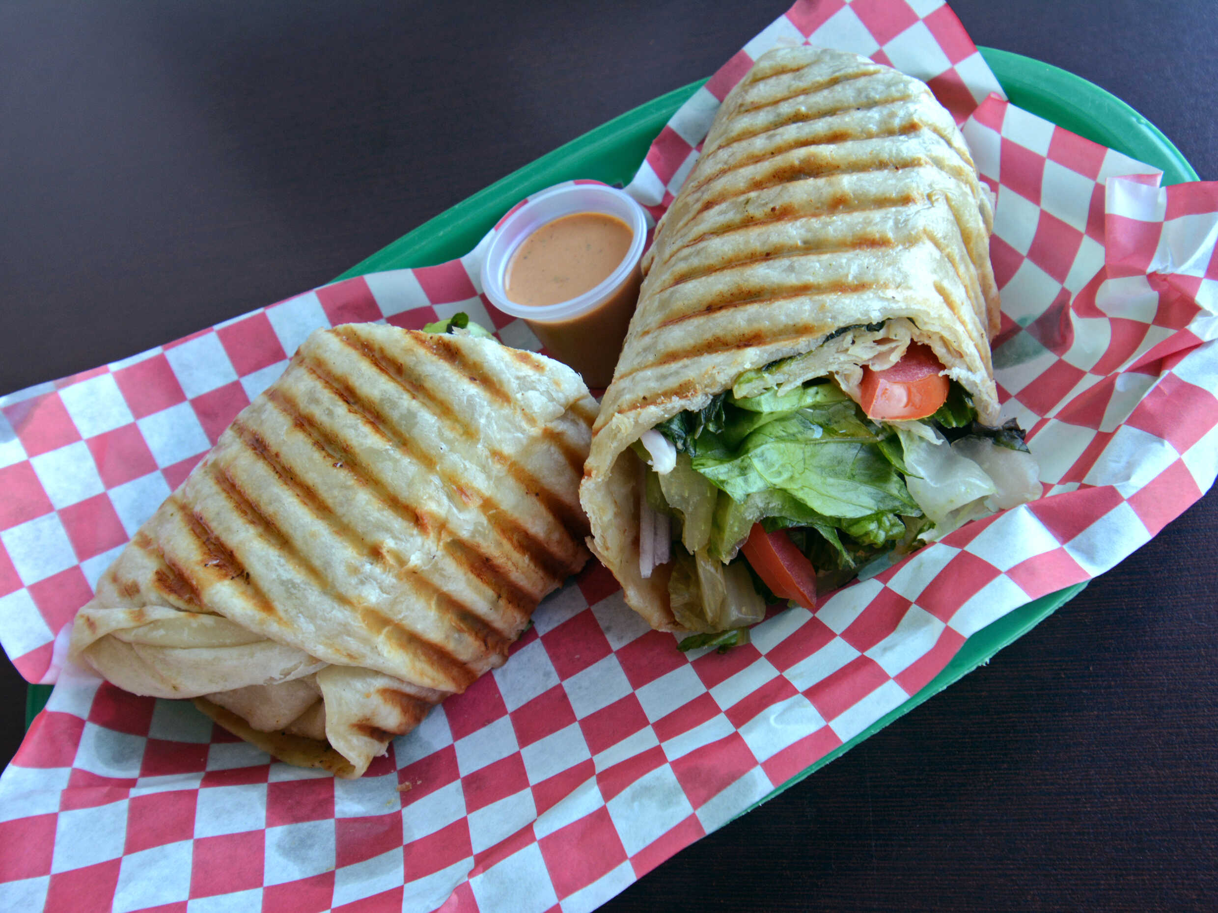 Elige pollo (bbq, plancha, cilantro, chipotle, pimenta limon, cilantro) , queso manchego y vegetales ( cebolla, pepinillos, jalapeños, jitomate)