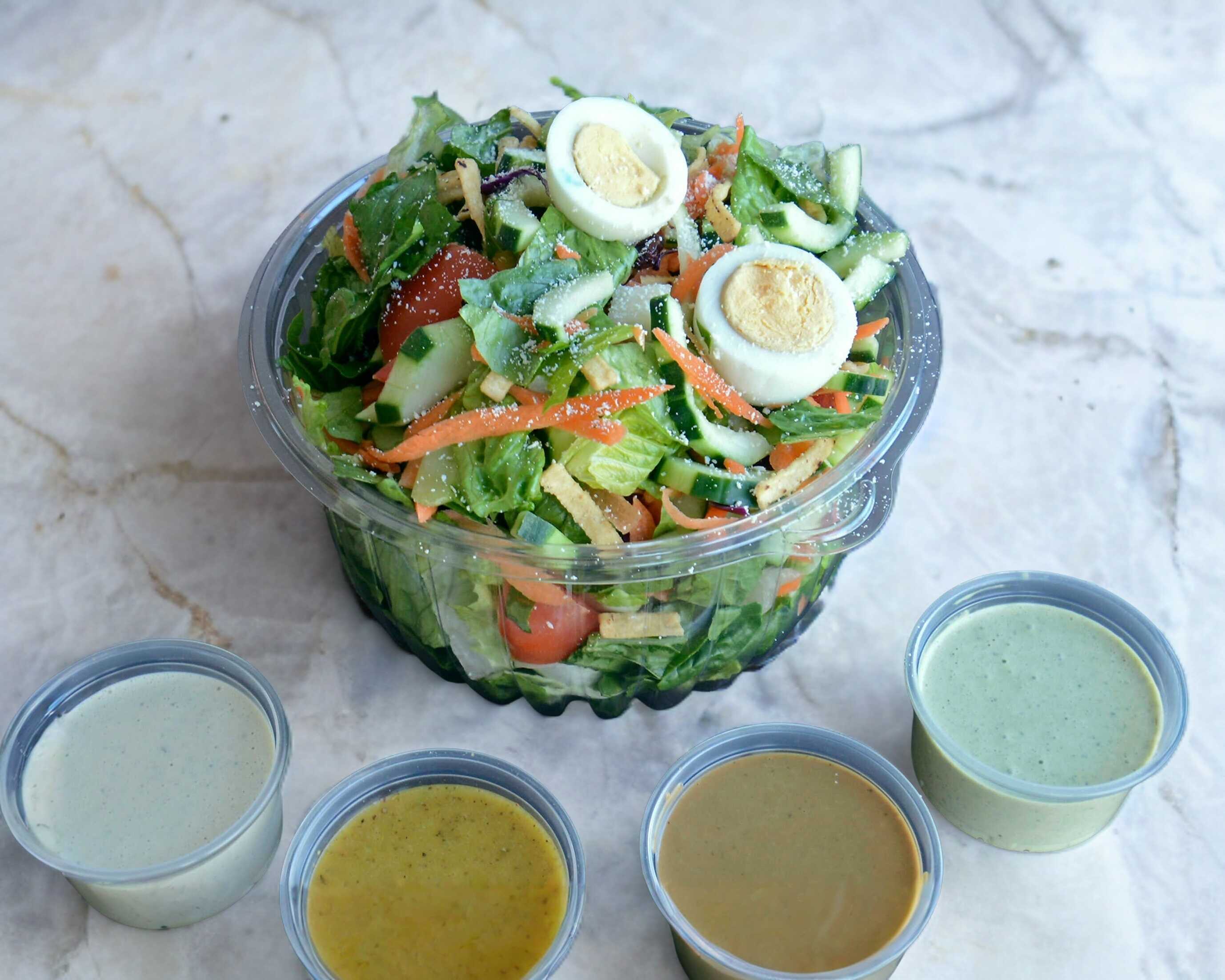 Base de lechuga orejona, con dos ingredientes a elegir de la barra de vegetales, 1 porcion de pollo, aderezos.