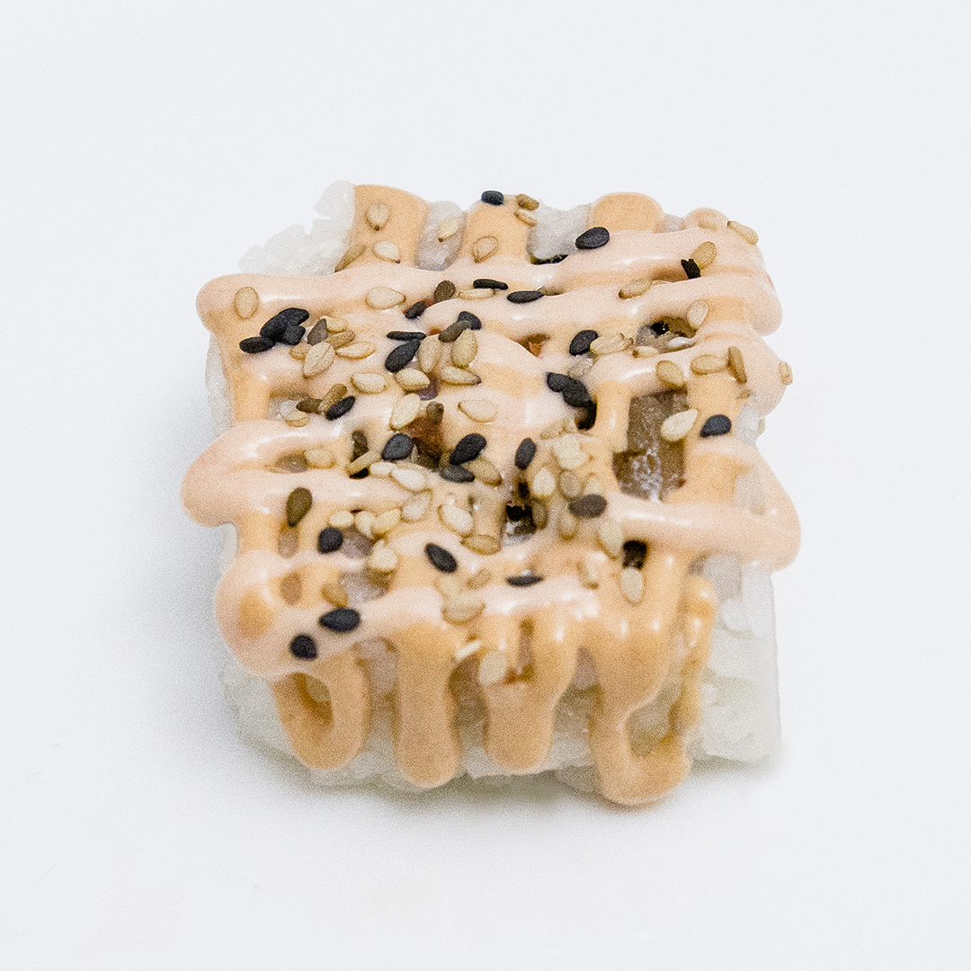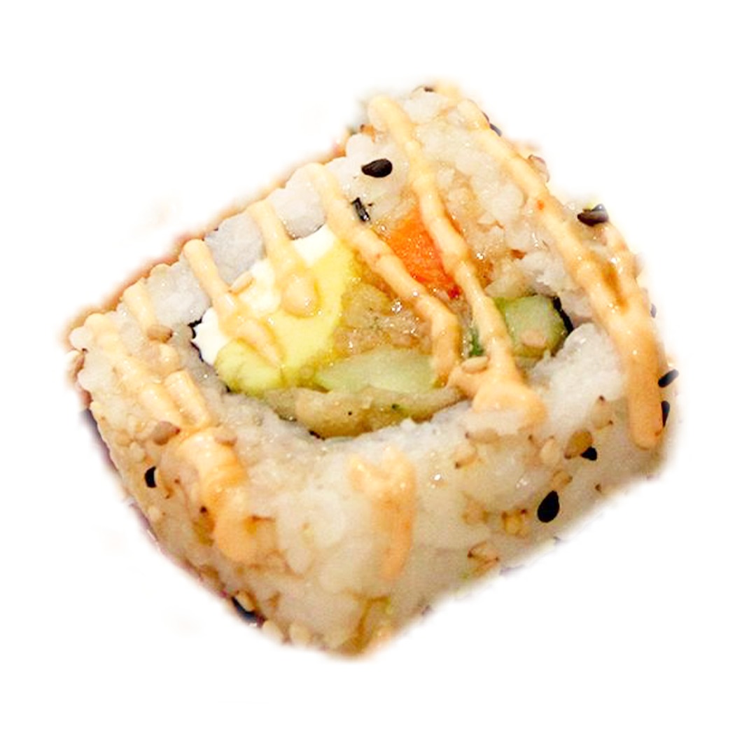 Alga por dentro relleno de una combinación de carne y camarón, pepino, zanahoria y queso crema, bañado en aderezo natural y aderezo chipotle.