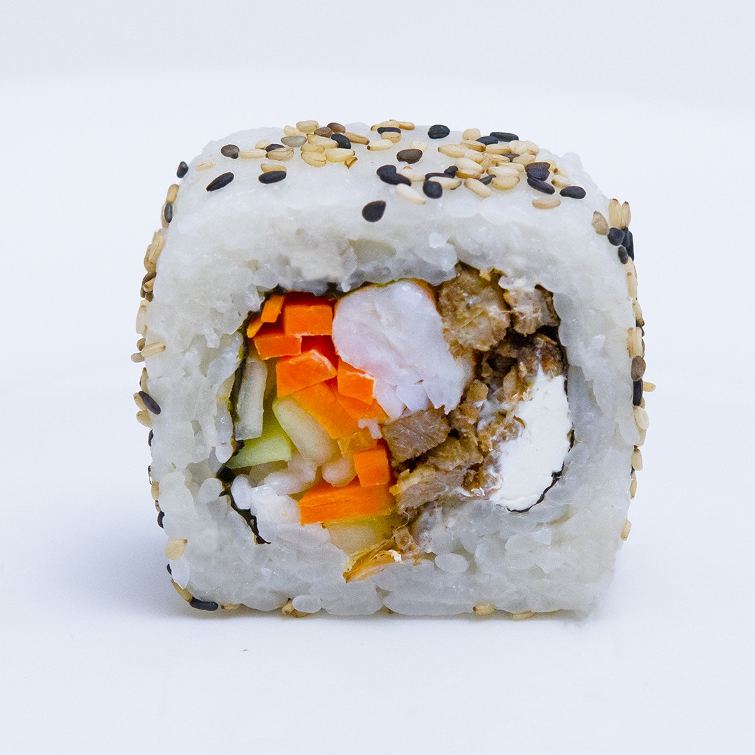 Alga por dentro relleno de una combinación de carne, camarón, pepino, zanahoria y queso crema, cubierto de queso philadelphia y bañado en salsa anguila y ajonjolí.
