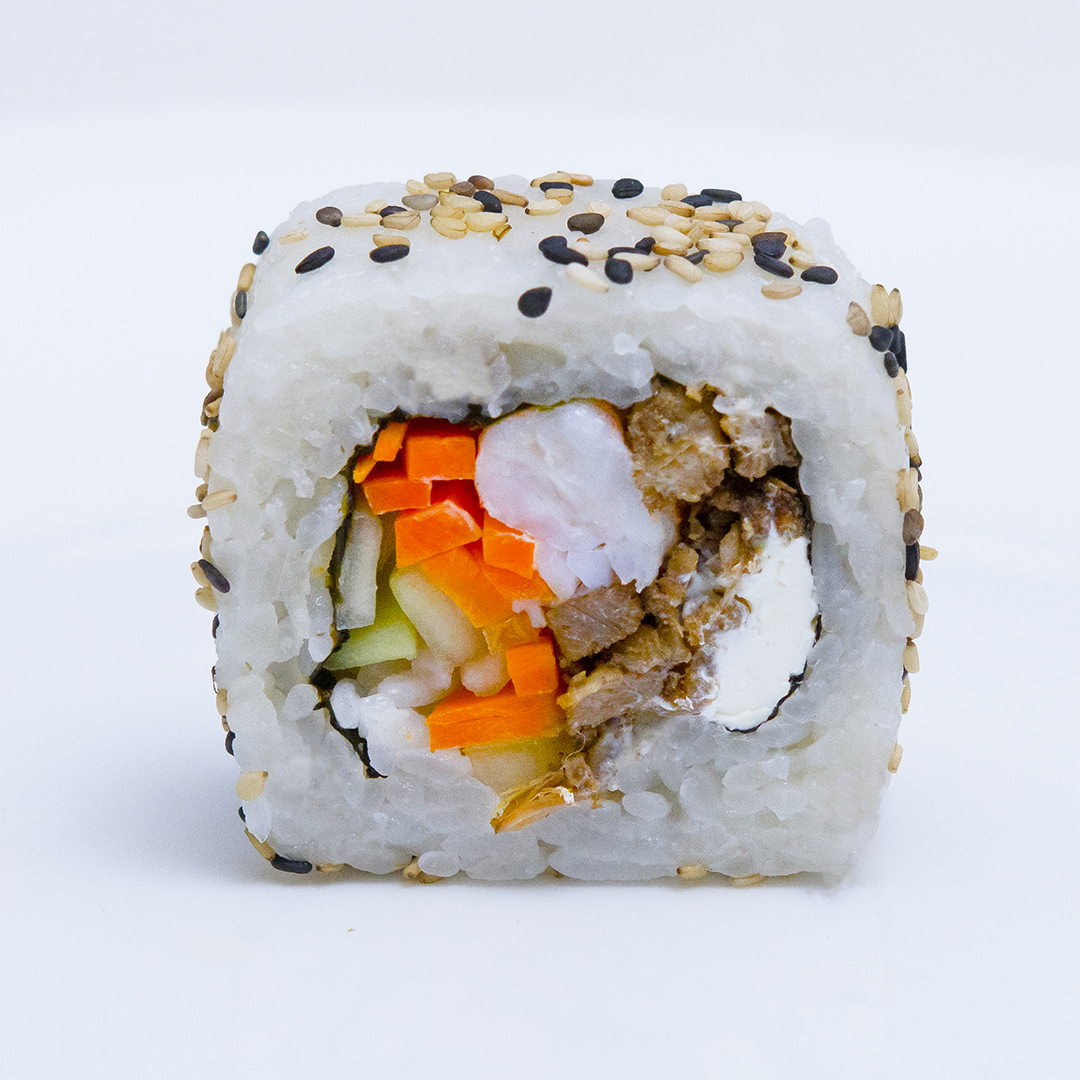 Alga por dentro relleno de una combinación de carne, camarón, pepino, zanahoria y queso crema, espolvoreado con ajonjolí.