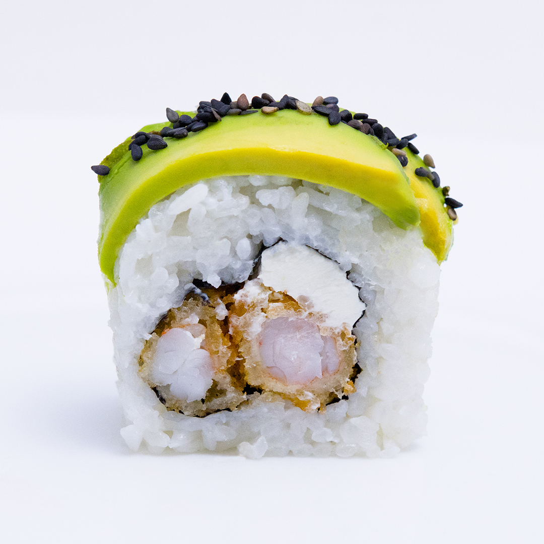 Alga por dentro relleno de camarón empanizado y queso crema, con una capa de aguacate, bañado en salsa anguila y ajonjolí.