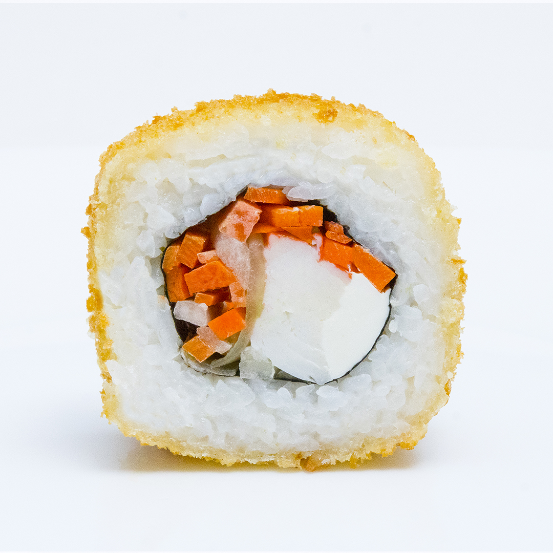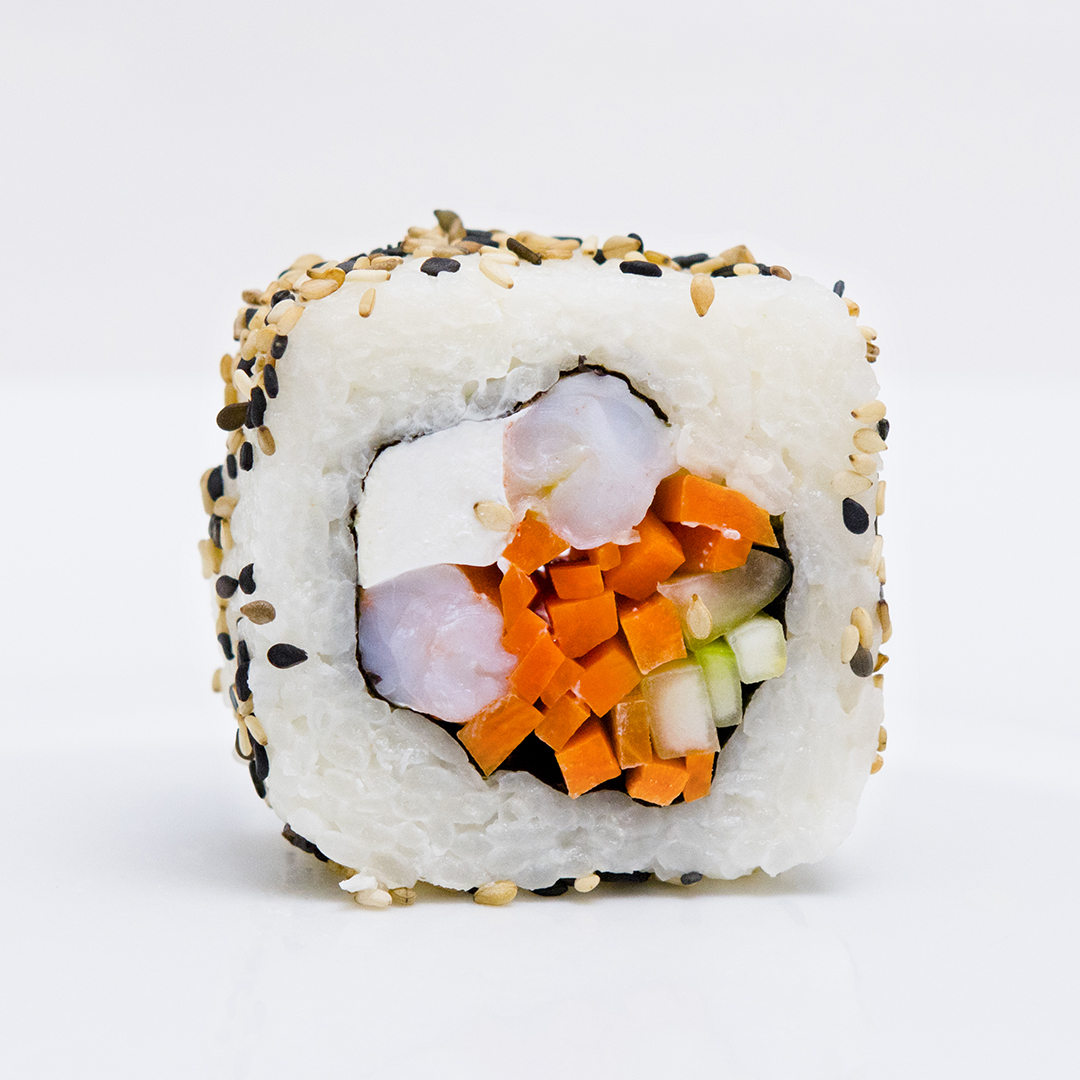 Alga por dentro relleno de camarón, pepino, zanahoria y queso crema.