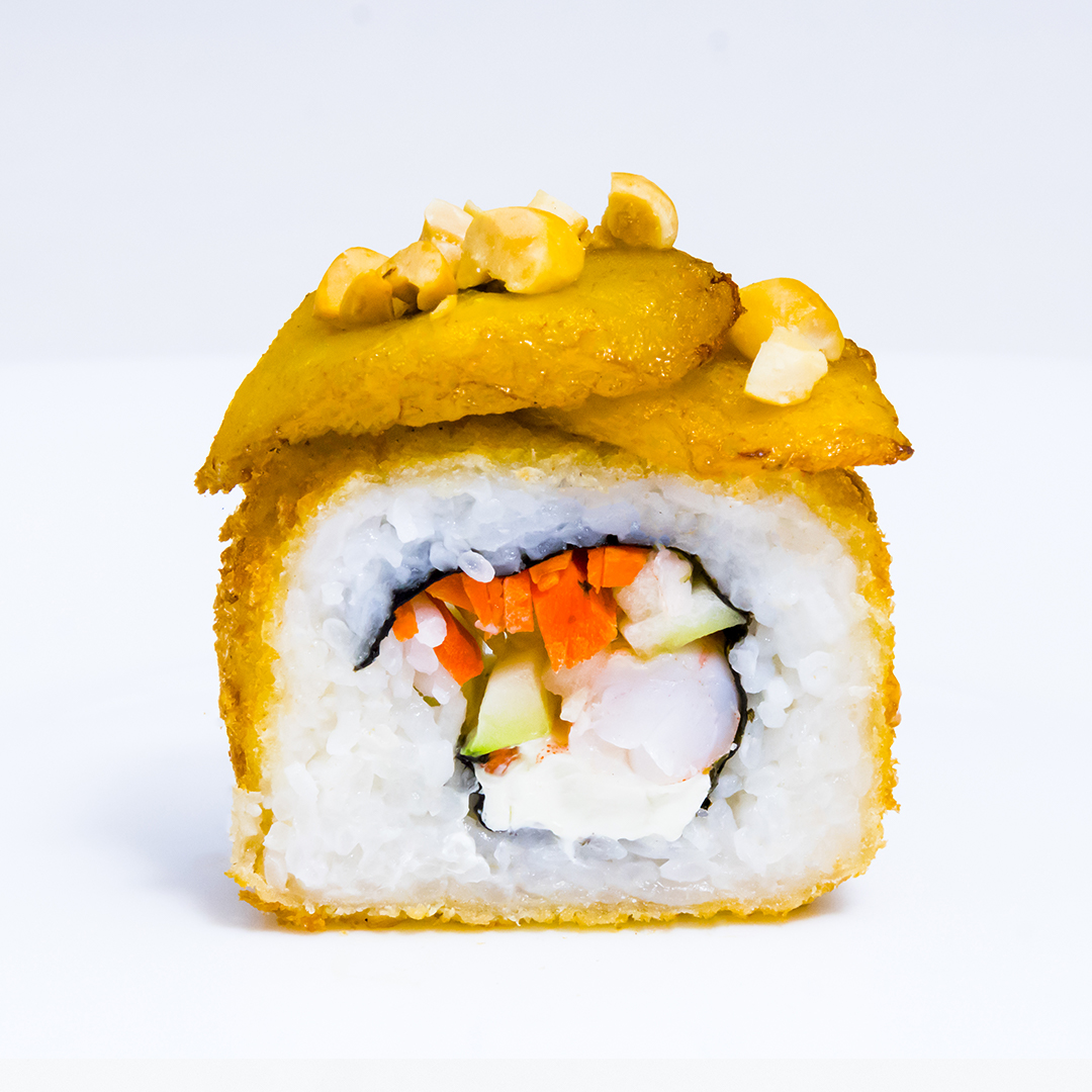 Alga por dentro relleno de camarón, pepino, zanahoria y queso crema, con una capa de plátano frito y salsa de anguila espolvoreado con cacahuate.