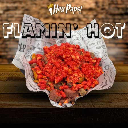 220g de papas a la francesa o en gajo sazonadas y acompañadas de Cheetos flaming molidos + 2 aderezos de tu elección.