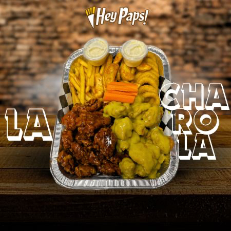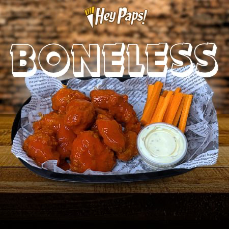 550g de Boneless naturales, bañados hasta en 2 aderezos de tu elección + 180g de Papas a la Francesa o en Gajo, sazonadas + 4 aros de cebolla (puede cambiarlo por 2 dedos de queso o 2 jalapeño poppers) + 2 aderezos de tu elección.