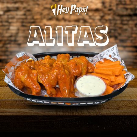 Orden de Alitas (8 Pzas) aproximadamente 650g, con una guarnición de papas a la francesa o Gajo de 140gr.