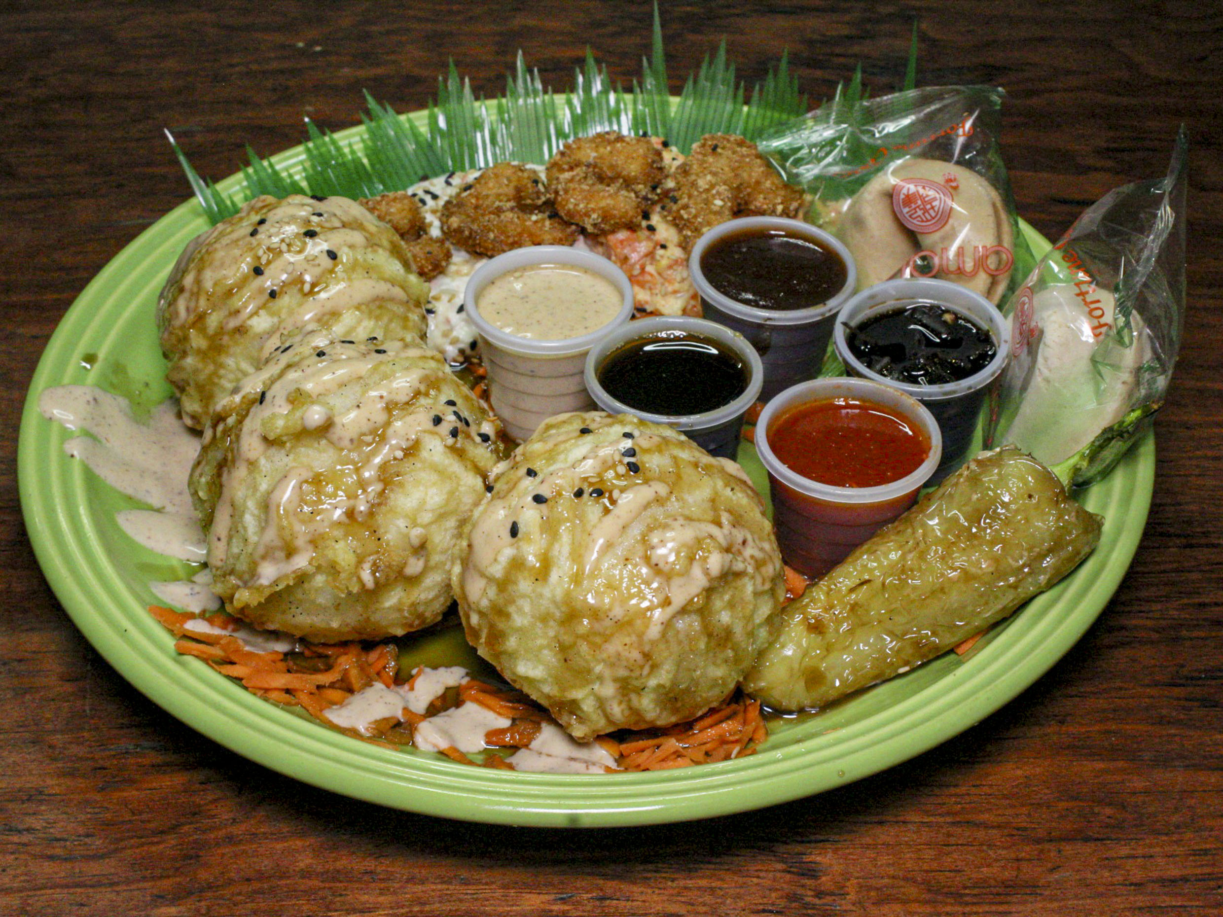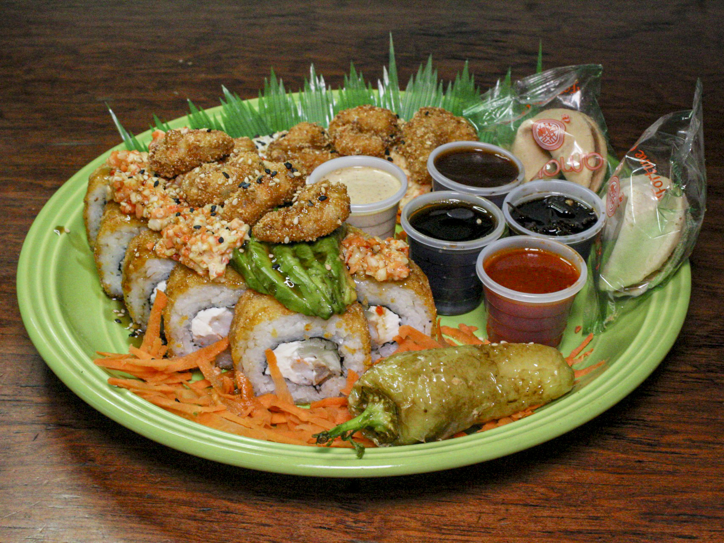 Consiste en agregar al platillo: medio aguacate, camarones empanizados, verduras ralladas, chilito wero, variedad de salsa y aderezos (chipotle, anguila BBQ, sriracha, toreados y soya), ensalada tampico, ensalada Miramar más 2 galletas de la fortuna.