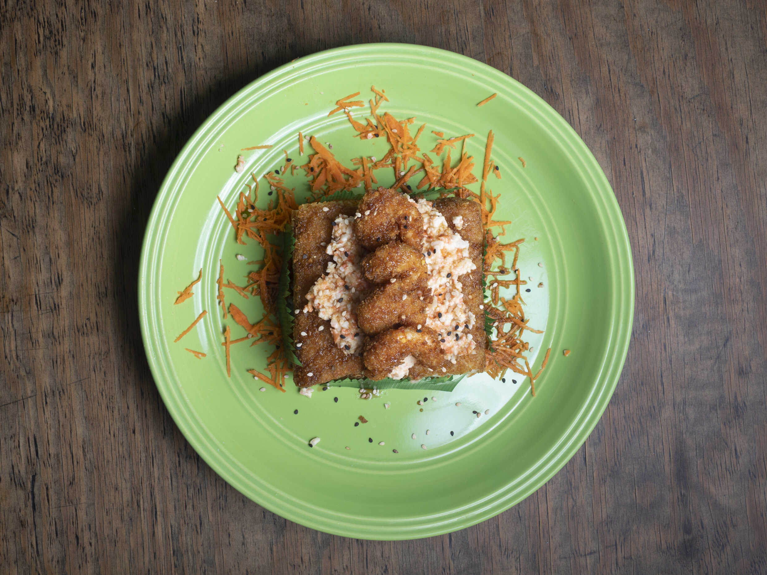 Rollo empanizado, por dentro camarón, pepino, aguacate y queso Philadelphia, por fuera top de ensalada tampico, camarones empanizados y bañado en salsa de anguila.