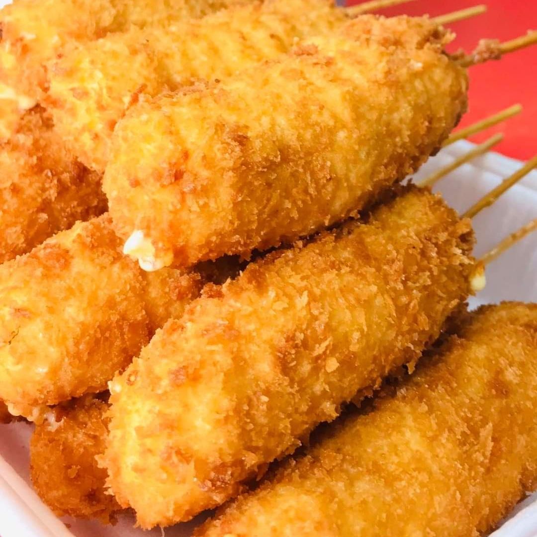 Brocheta de queso Philadelphia empanizada, acompañada de salsa BBQ.