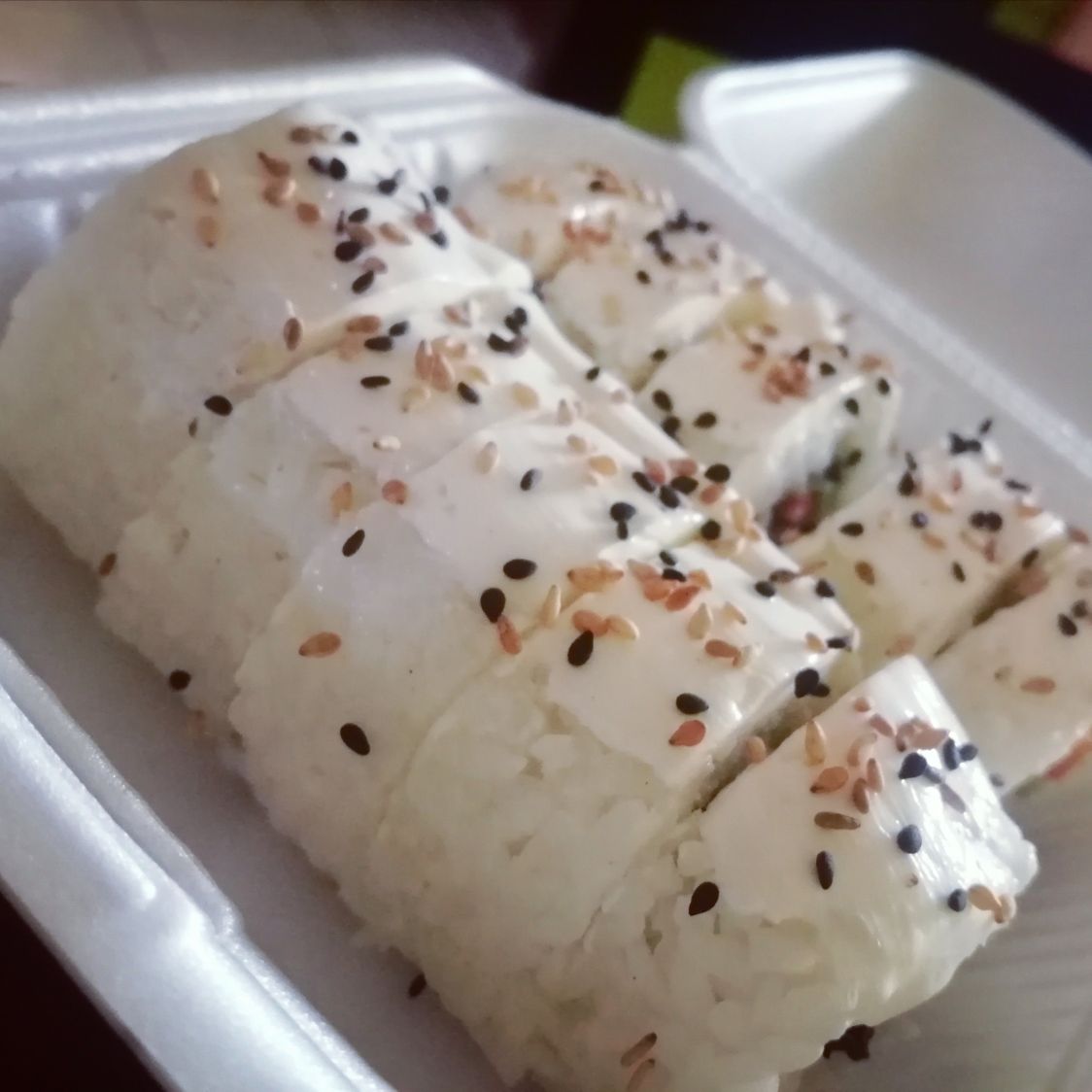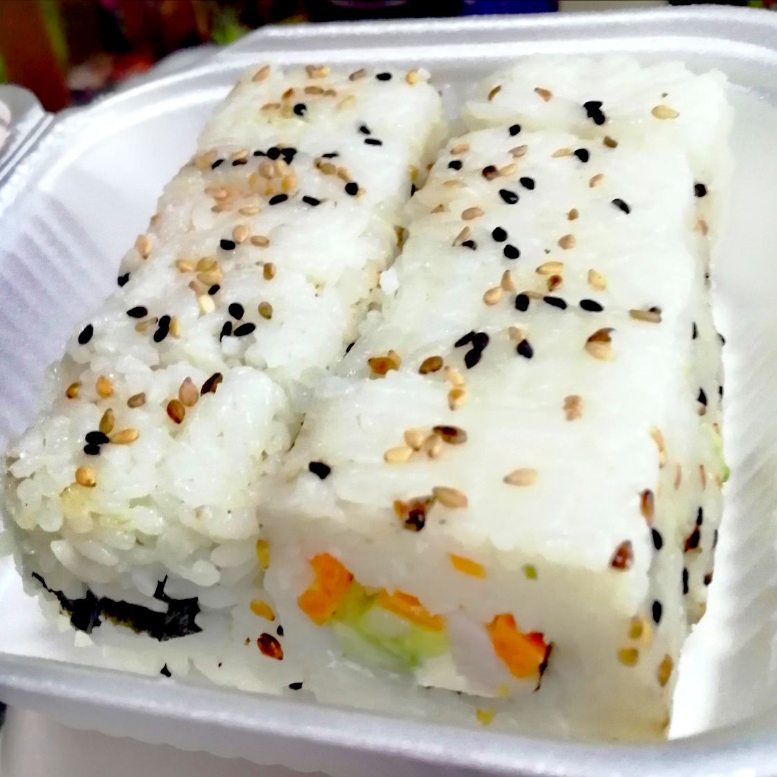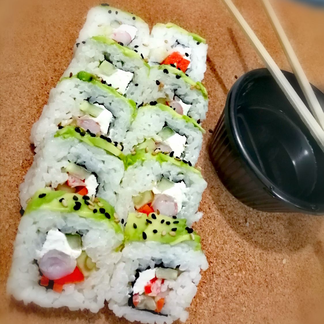 Philadelphia, camarón, pepino y zanahoria por dentro, acompañado de aguacate y ajonjolí tostado por fuera.