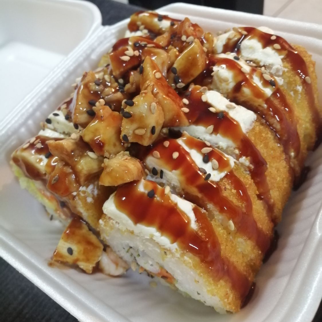 Camarón, aguacate y zanahoria por dentro. Philadelphia, camarón y pollo salteado, bañado en salsa BBQ y ajonjolí tostado.
