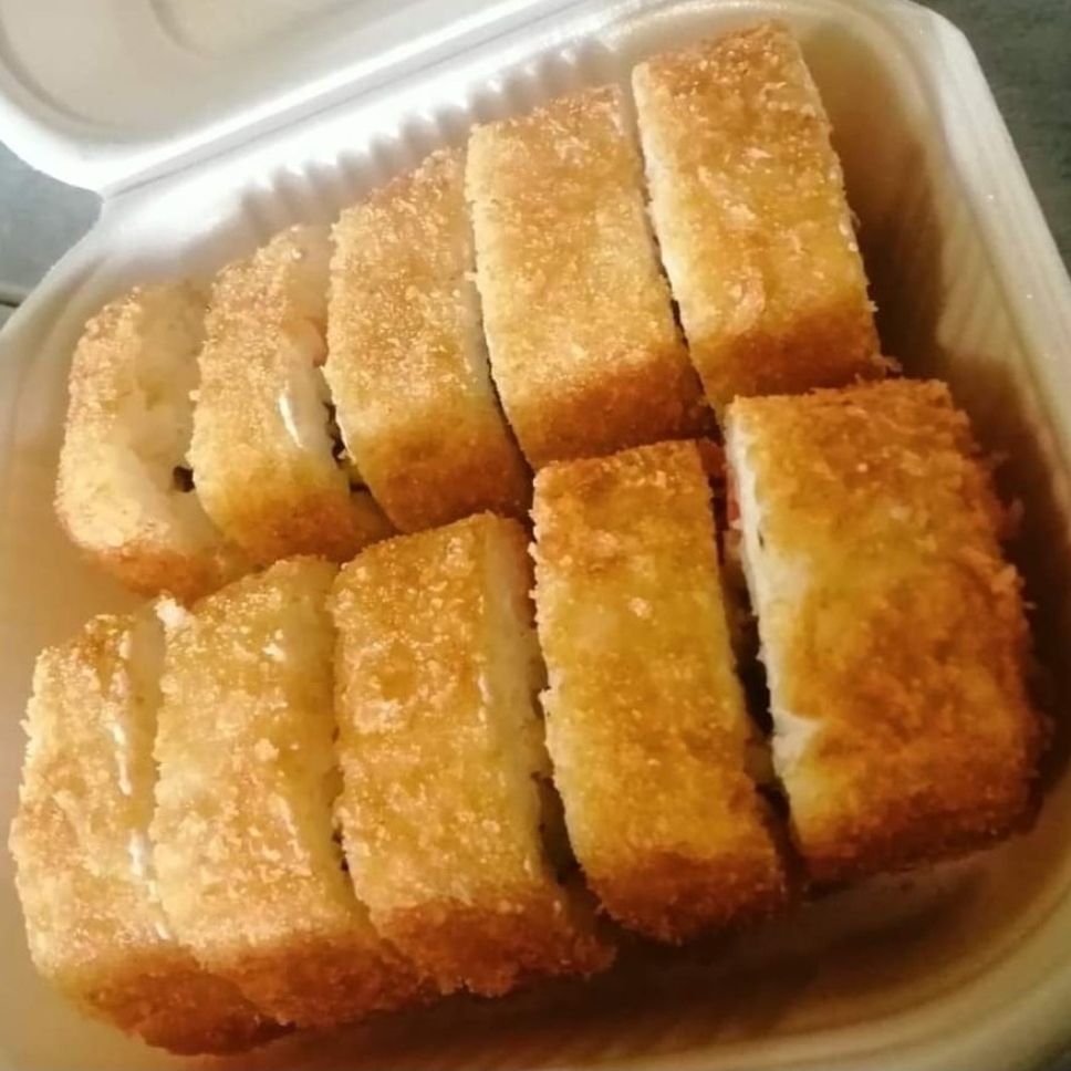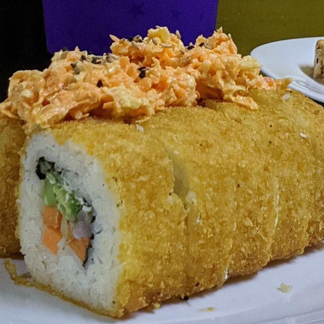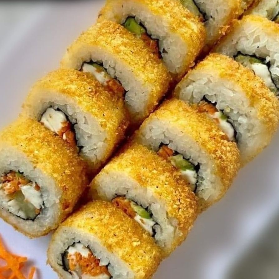 Philadelphia, camarón, aguacate, pepino y zanahoria por dentro, empanizado con plátano por fuera.
