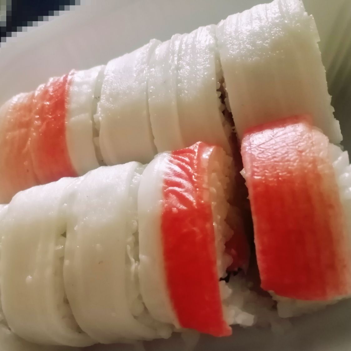 Philadelphia, camarón, aguacate, pepino y zanahoria por dentro, cubierto con surimi por fuera.