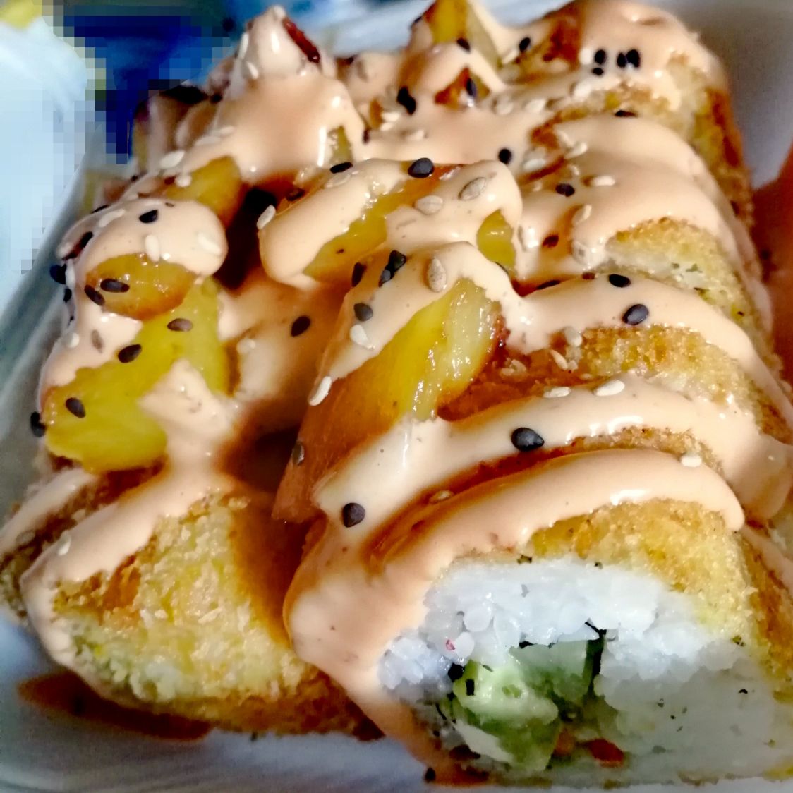 Philadelphia, camarón, aguacate y zanahoria por dentro. Piña salteada, aderezo chipotle y ajonjolí tostado por fuera.