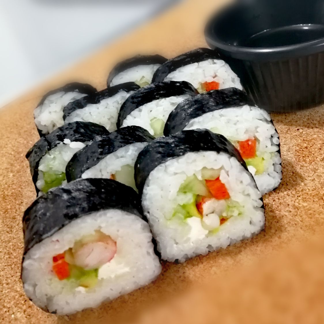 Camarón, pepino, zanahoria, aguacate por dentro. Gratinado, coronado con tocino, cebollín y ajonjolí tostado por fuera.
