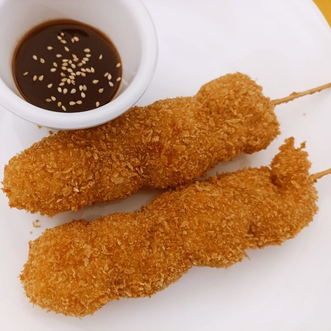 Brocheta de camarón y queso Philadelphia, empanizada y acompañada con salsa BBQ.