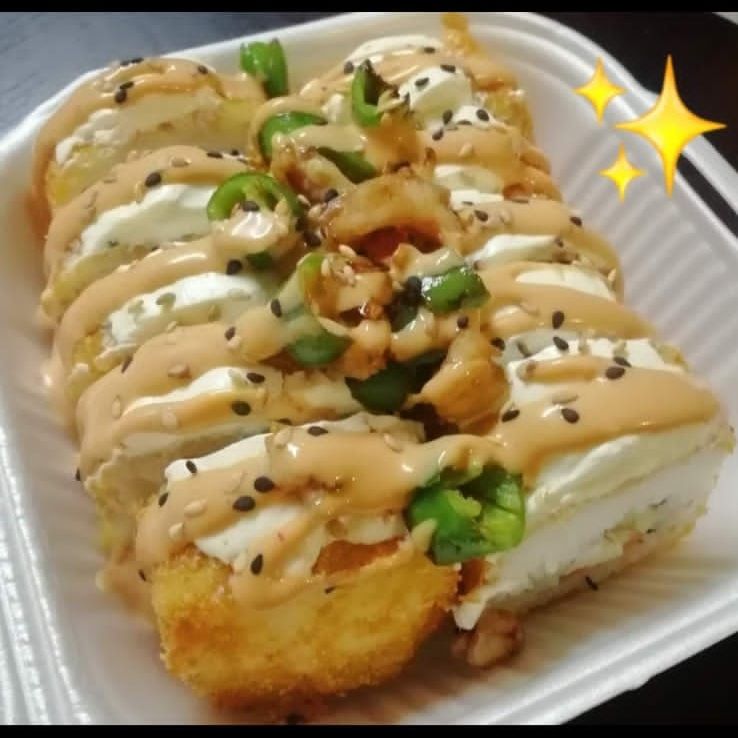 Por dentro: Philadelphia, camarón, pepino y zanahoria. Por fuera: aguacate, ensalada tampico, camarón empanizado, chipotle, cebollín y ajonjolí.