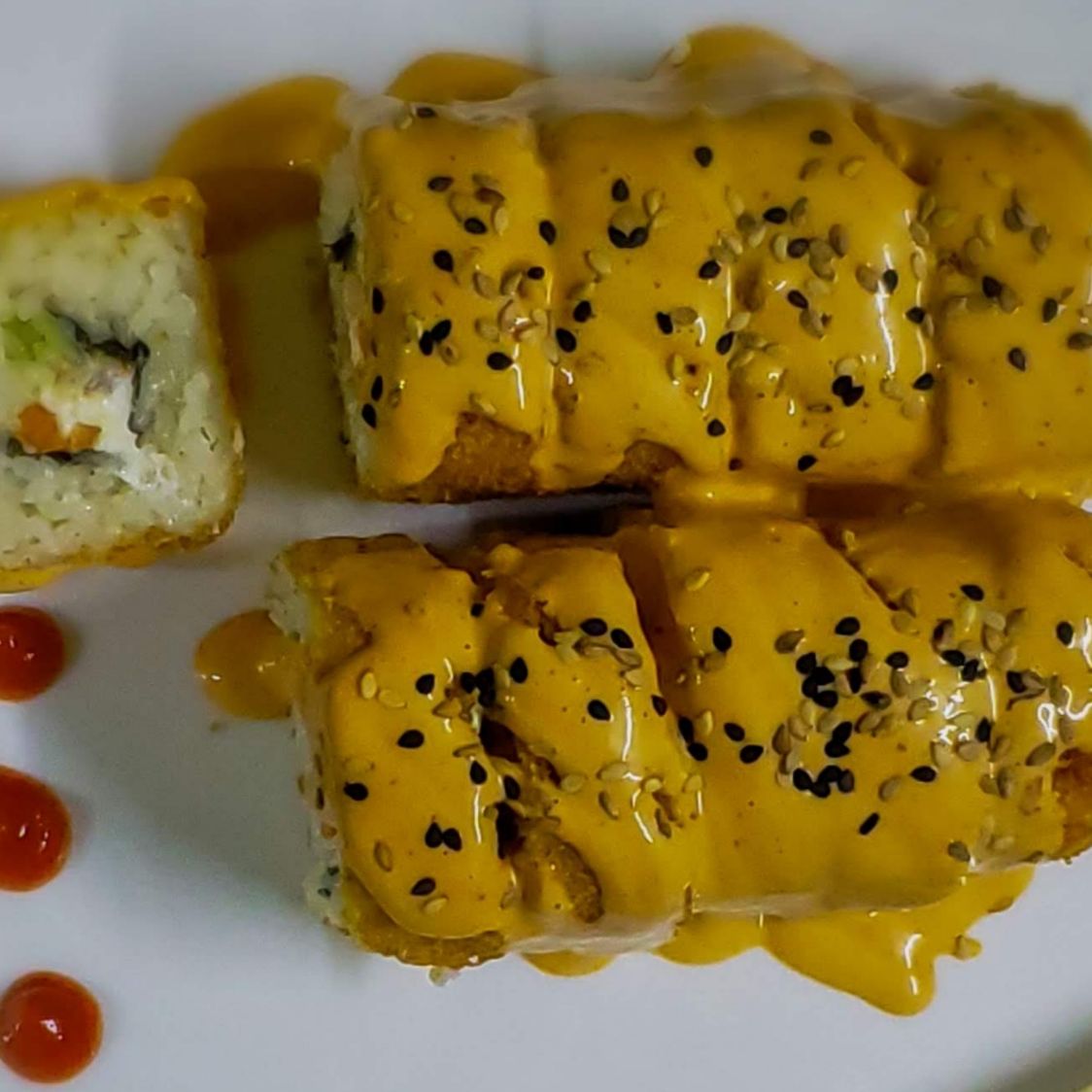 Philadelphia, camarón, aguacate, pepino y zanahoria por dentro, bañado en aderezo de chipotle por fuera.