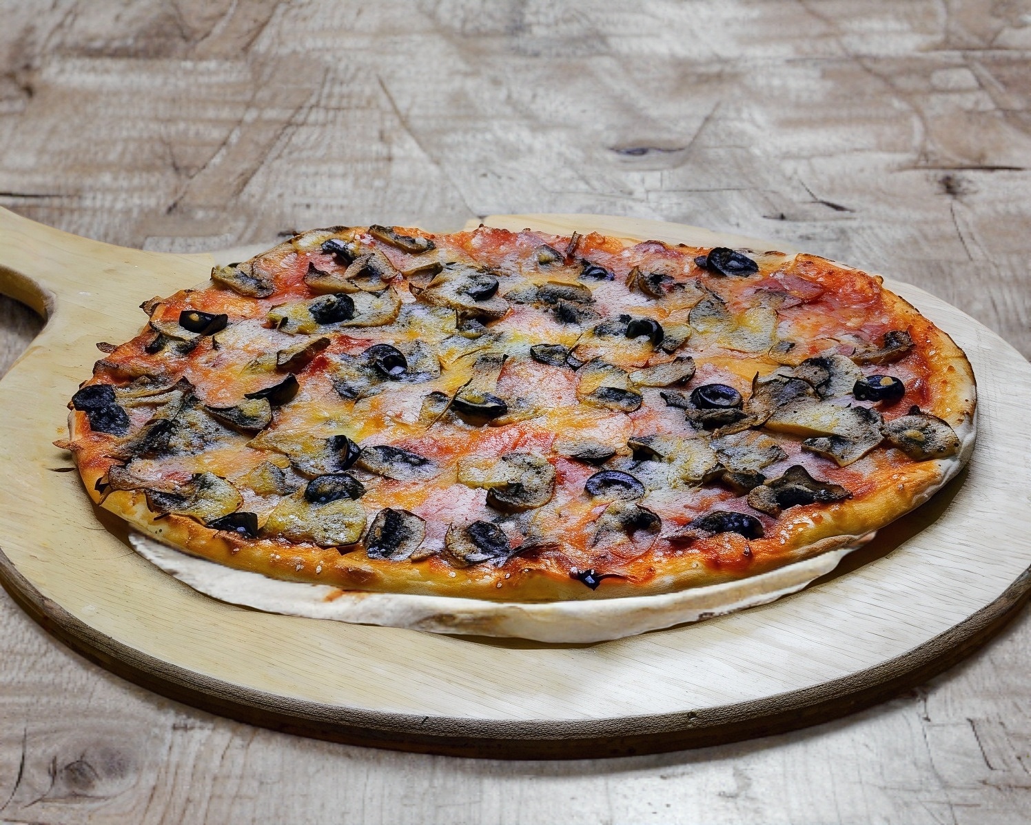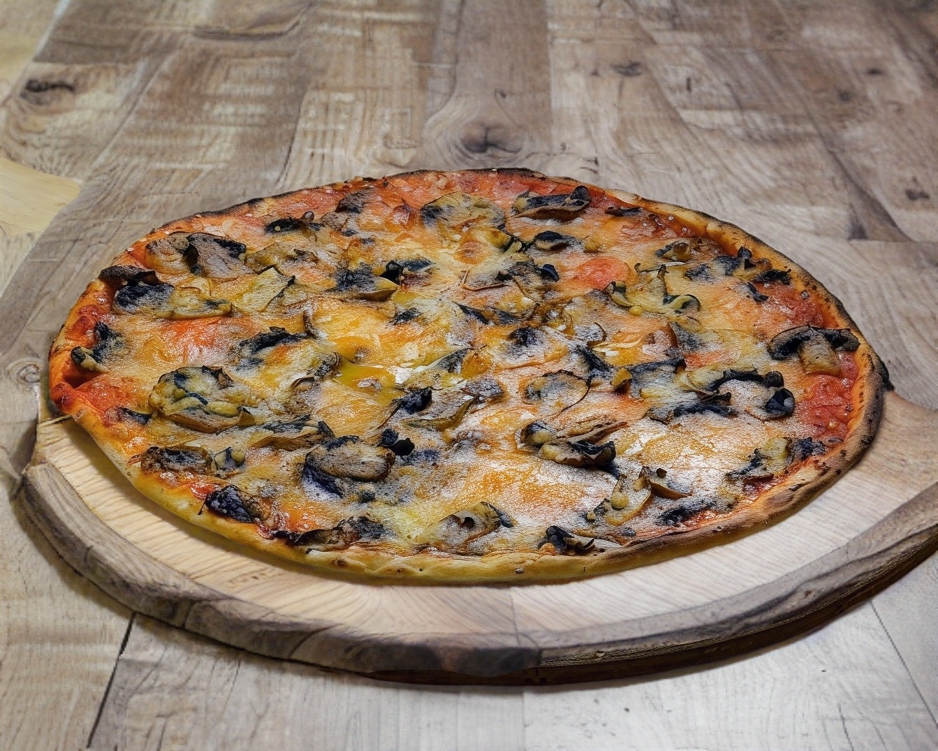 Deliciosa pizza a la leña (30 cm de diámetro) con champiñones frescos queso artesanal y tomate.