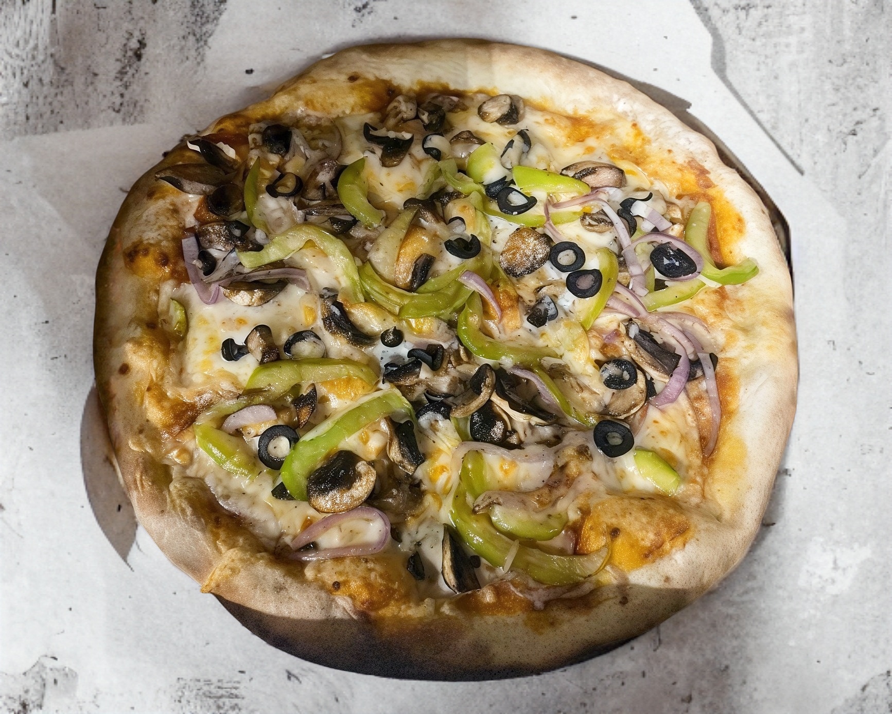 (30 cm de Diametro) con deliciosa salsa de tomate, queso artesanal, crujiente pimiento verde, fresco champiñón, cebollita morada y la inigualable aceituna negra