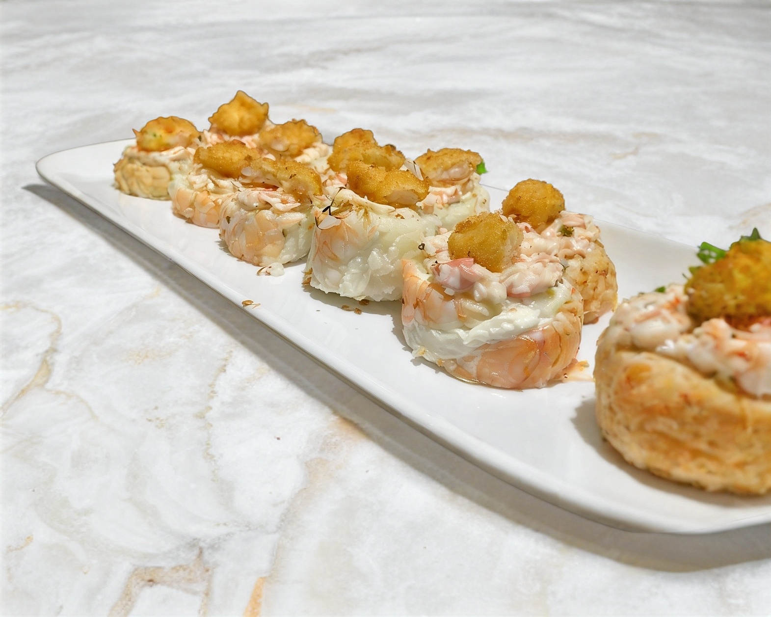Camarón, alga, queso Philadelphia, pepino, aguacate, rollo empanizado decorado con ensalada Tampico y camarón empanizado