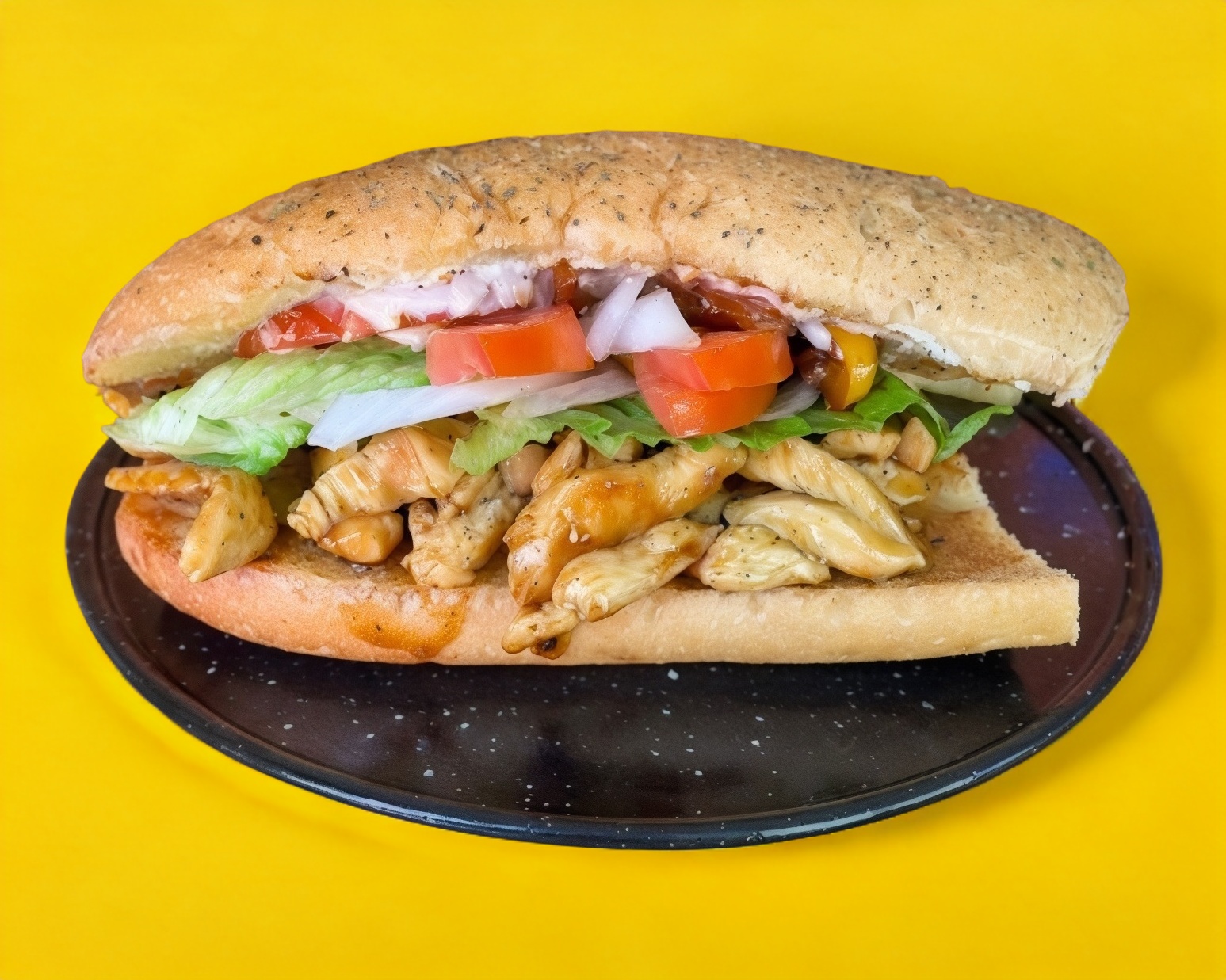 Pollo a la plancha, en salsa BBQ HOT, con vegetales, incluye papas fritas