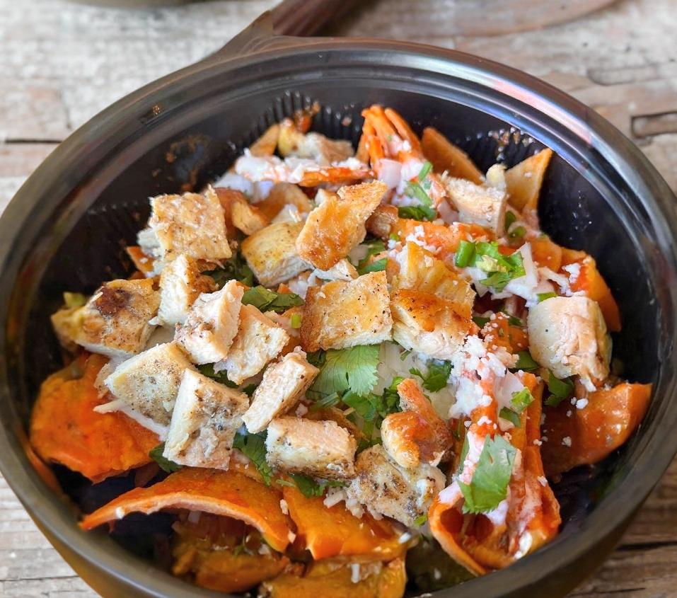 Pollo a la plancha con salsa Mango Habanero, con vegetales, incluye papas fritas.