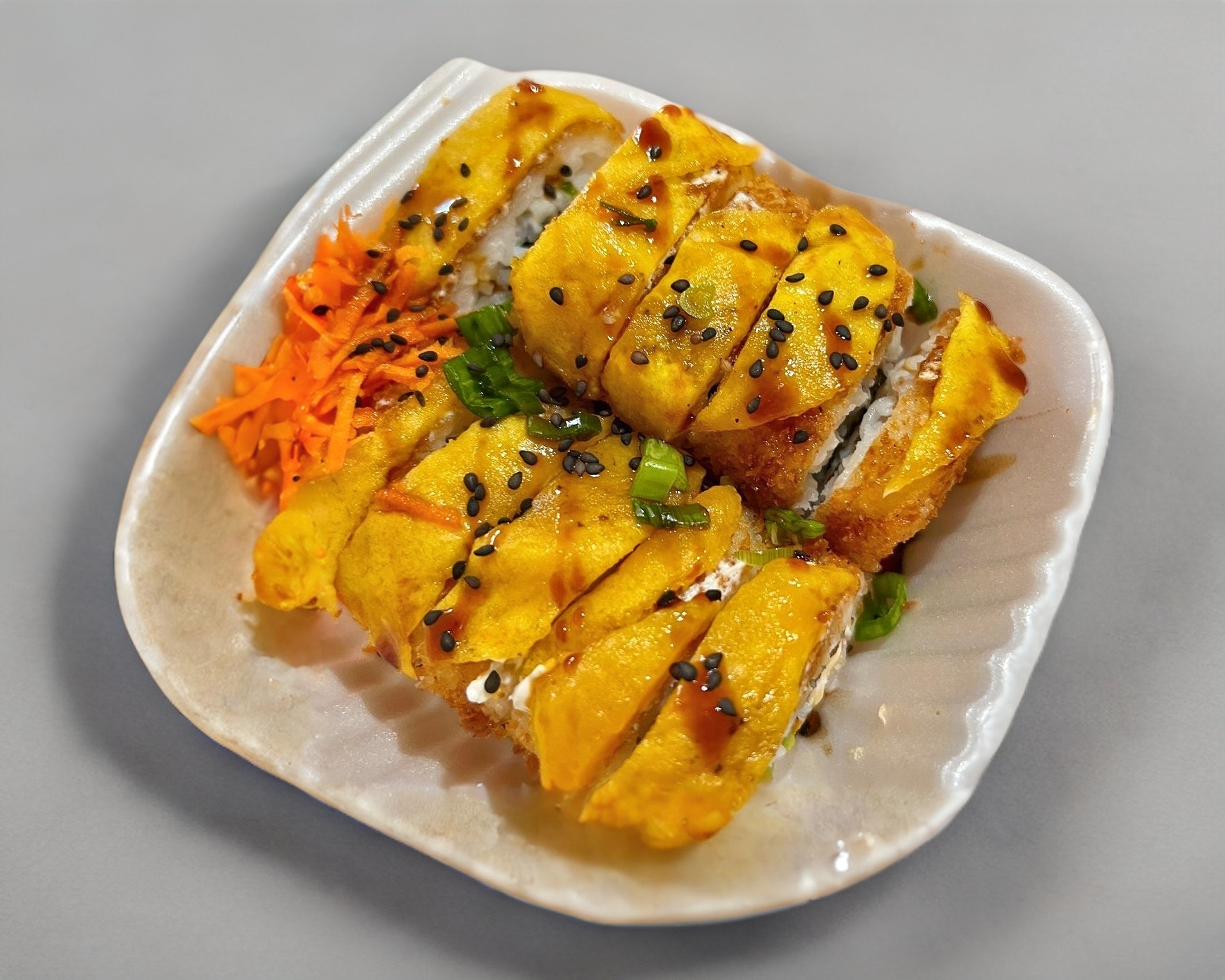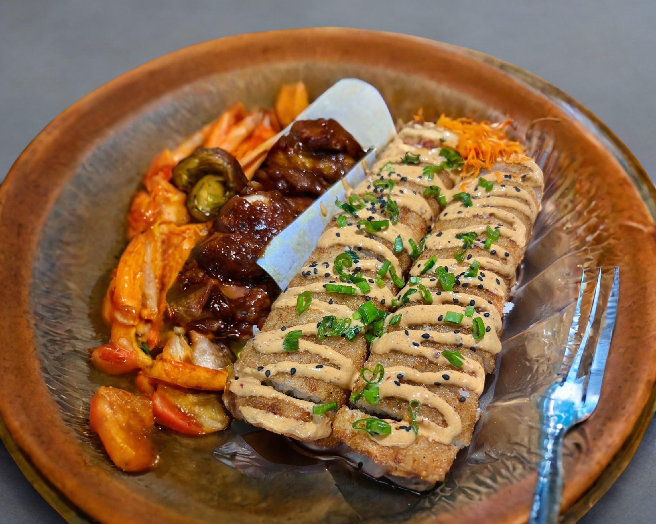 Rollo empanizado 10 piezas, por fuera ensalada tampico, aguacate y camarones capeados con salsa bbq