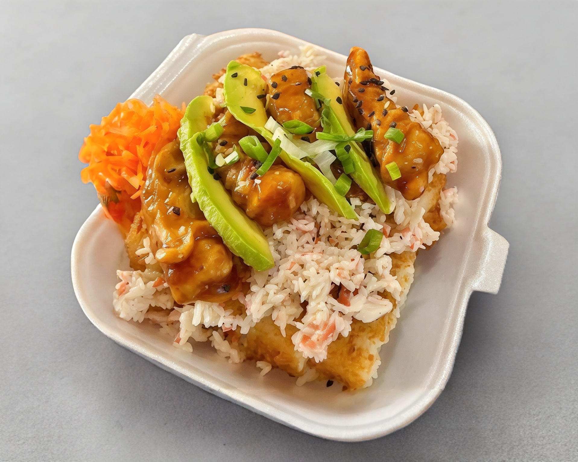 Arroz frito con zanahoria, calabaza, aguacate, philadelphia, carne de res y camarón