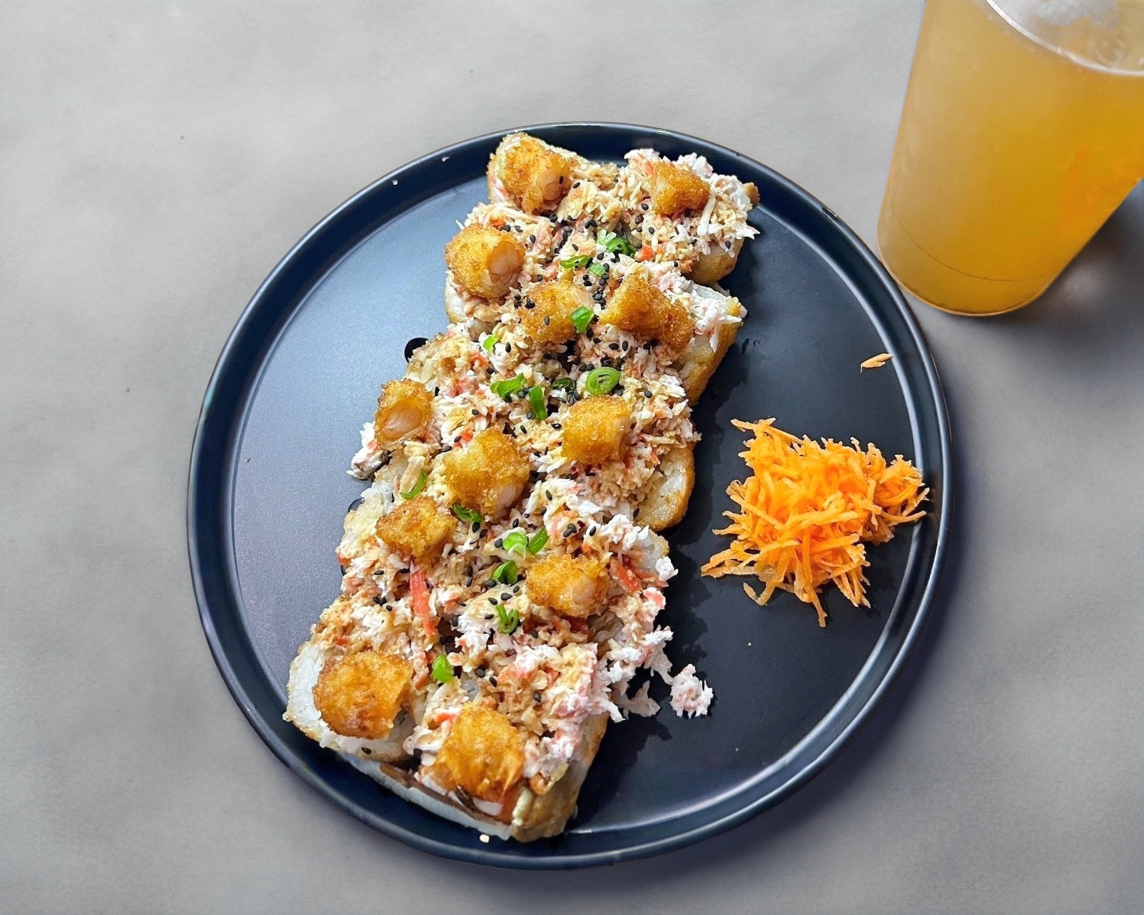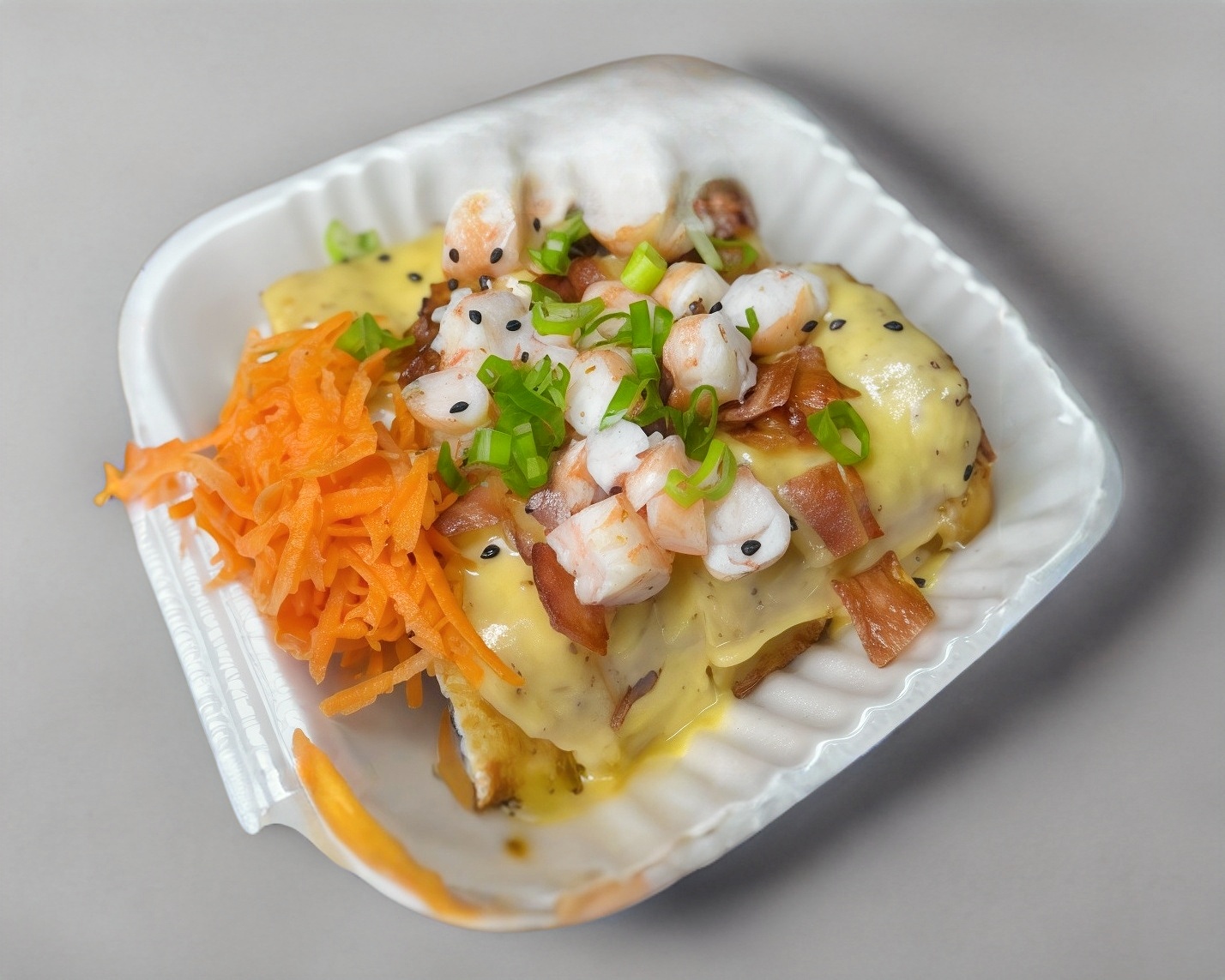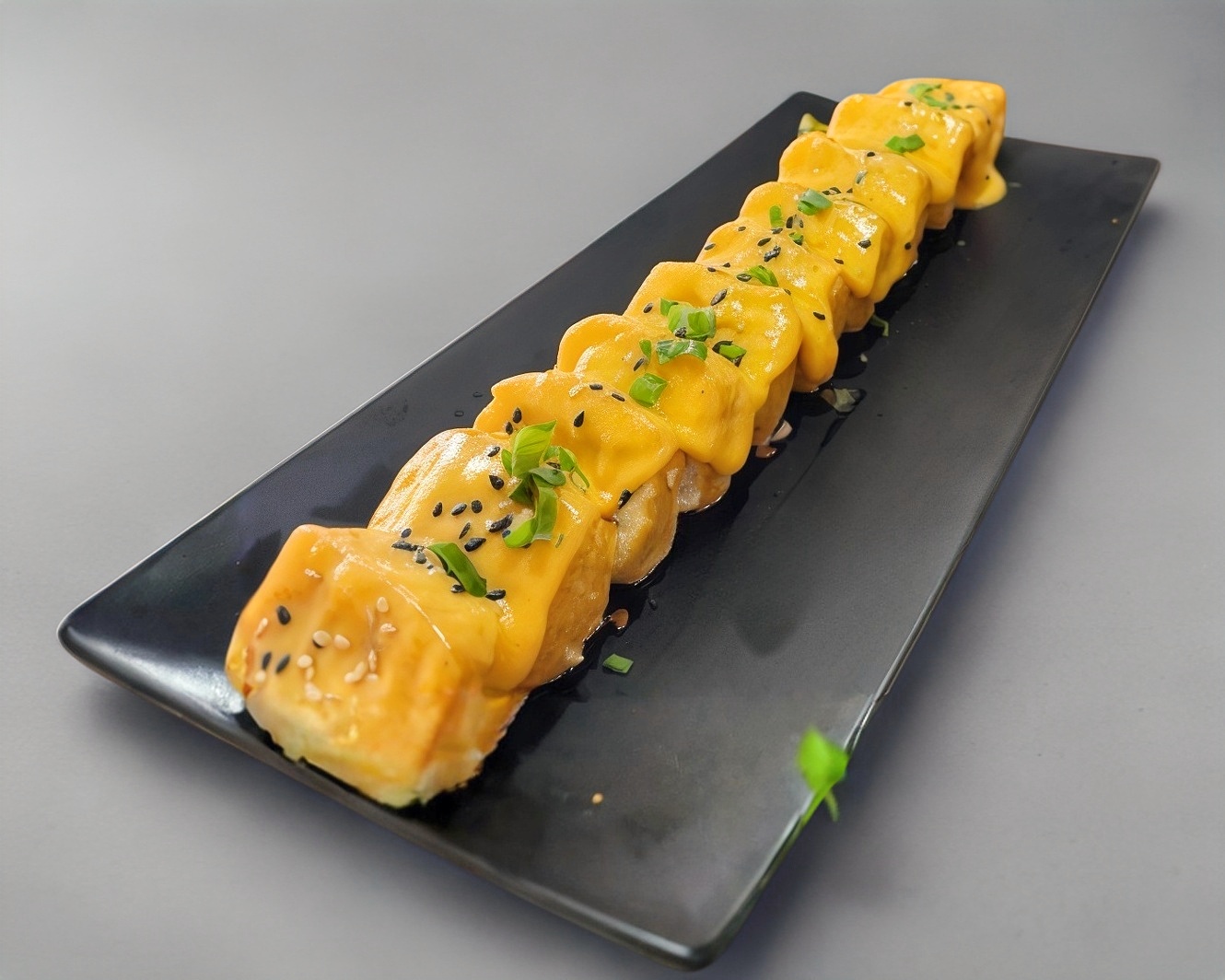 Rollo empanizado 10 piezas, cubierto de queso derretido con aderezo chipotle, trozos de camarón y tocino