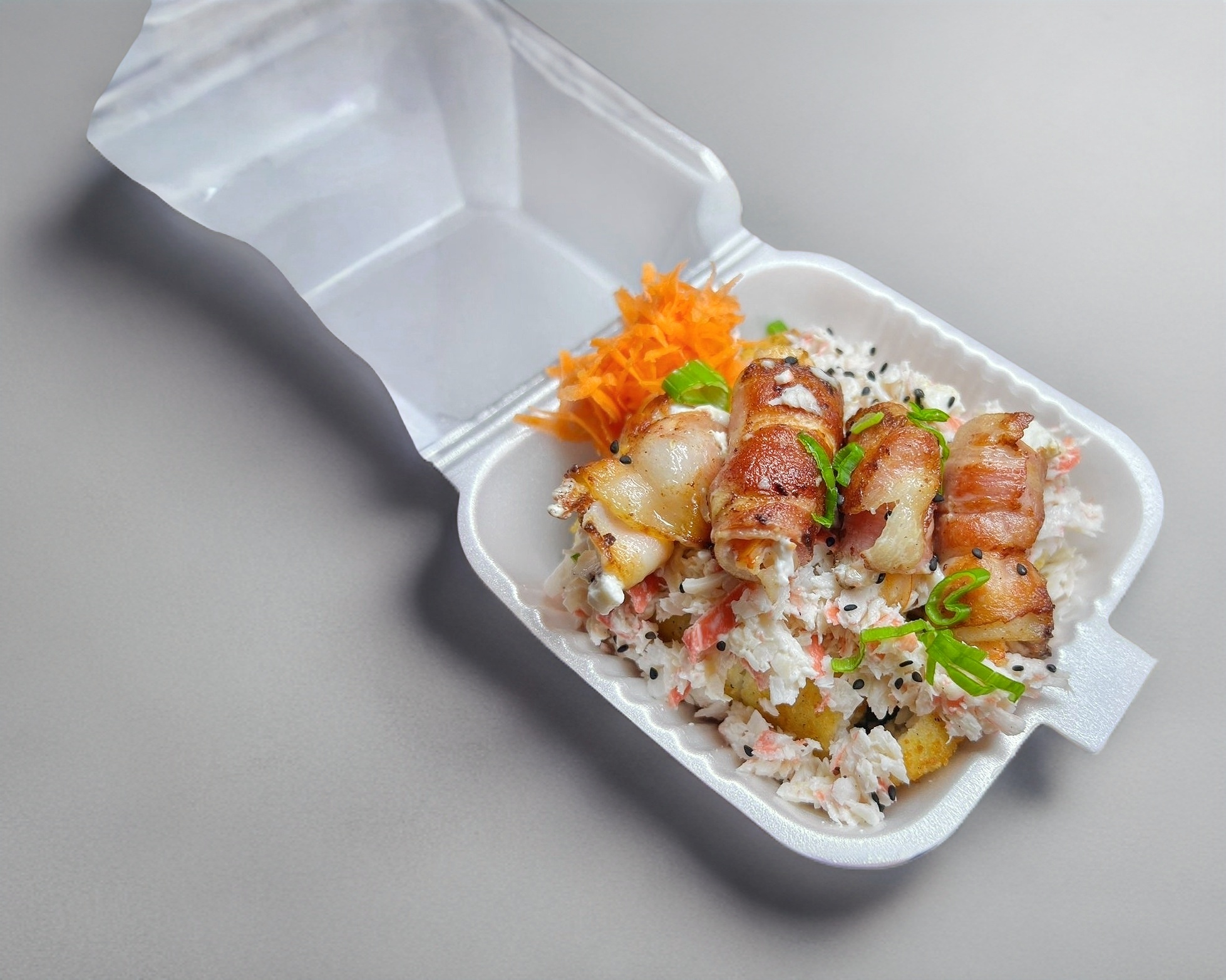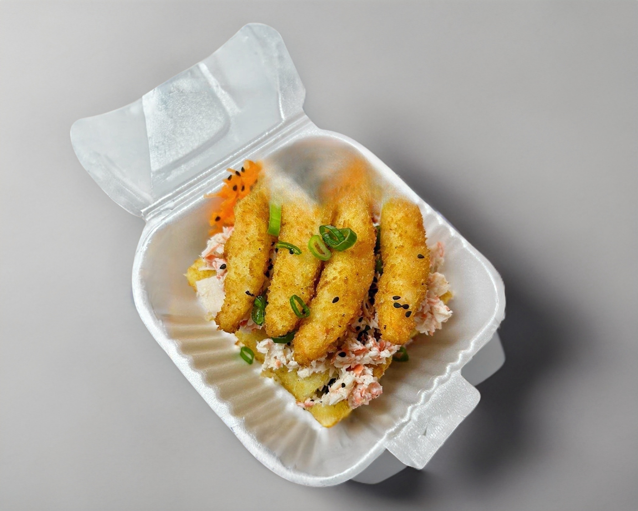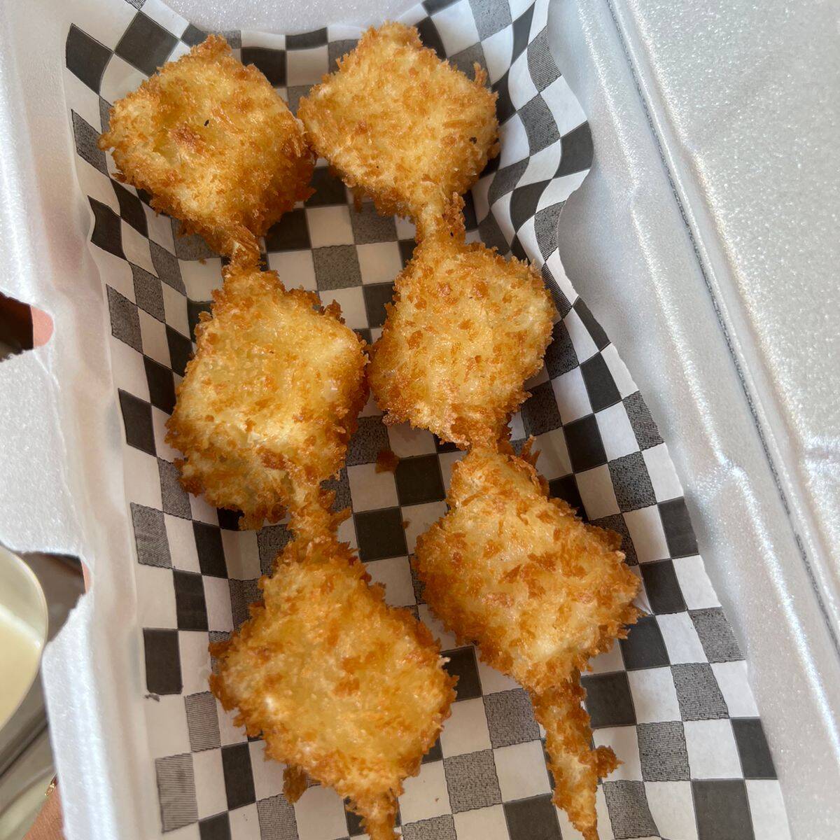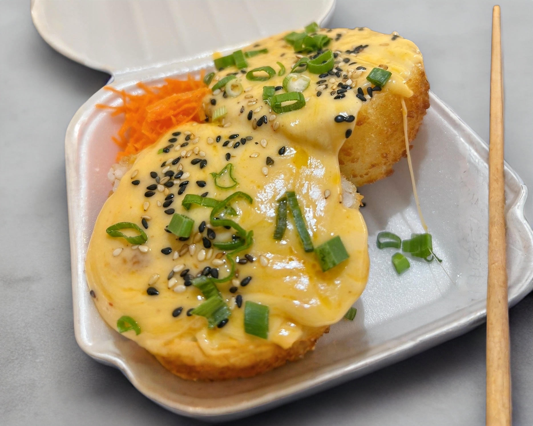 Rollo empanizado 10 piezas, cubierto de queso derretido con aderezo chipotle, trozos de camarón y tocino