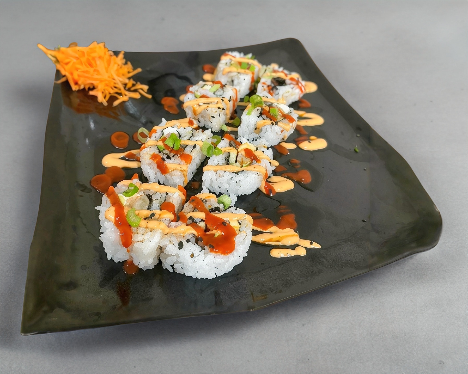 Rollo natural 8 piezas, por fuera aderezo chipotle, siracha y salsa de anguila