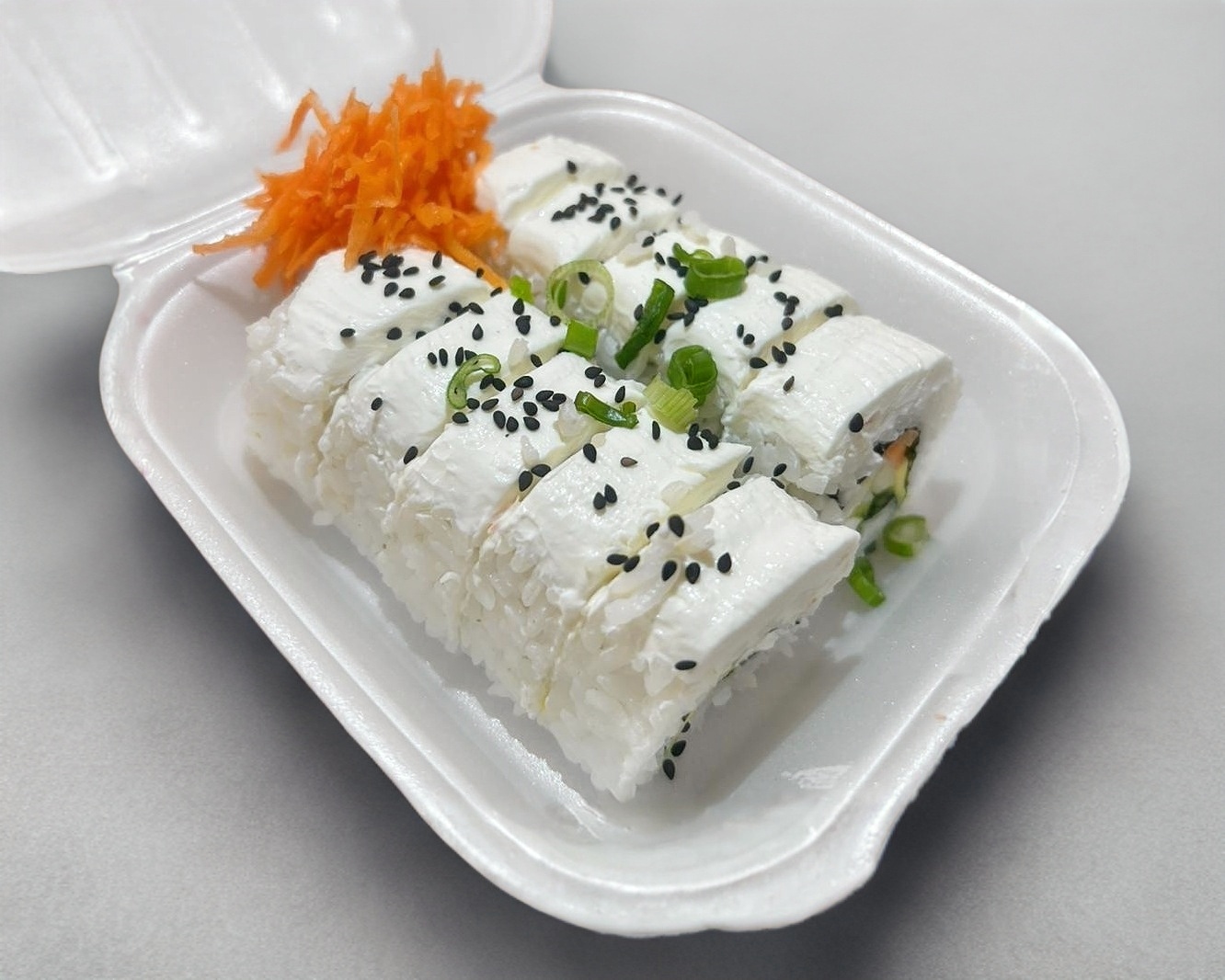 Una bola de fuego grande, por dentro philadeplhia, aguacate, pepino, zanahoria y camarón. Por fuera queso derretido