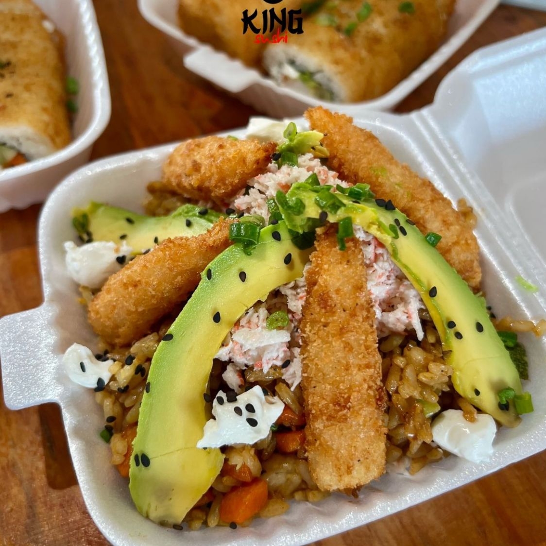 Arroz frito con zanahoria, calabaza, aguacate, philadelphia, ensalada tampico y camarones empanizados