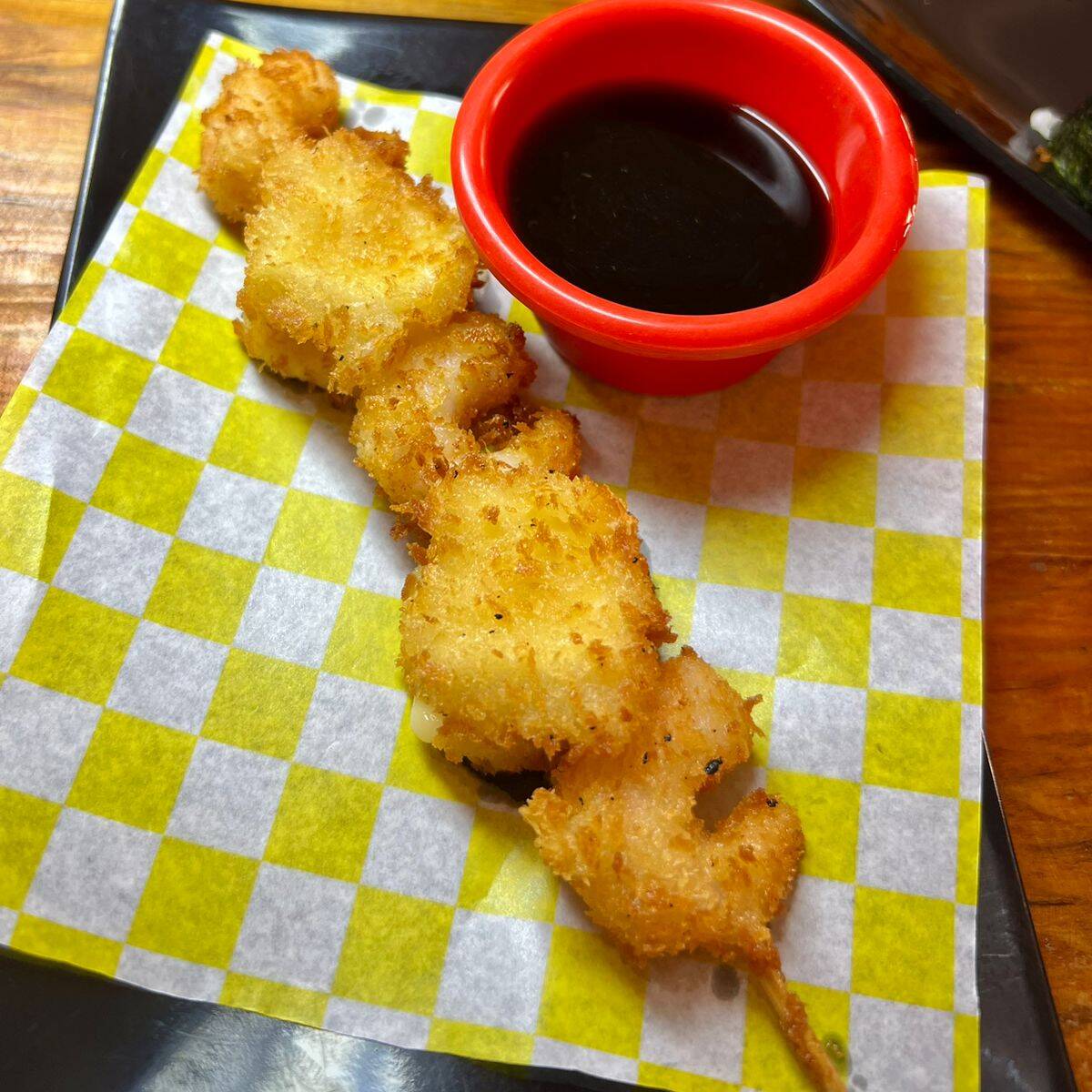 Brocheta de camarón con queso empanizados