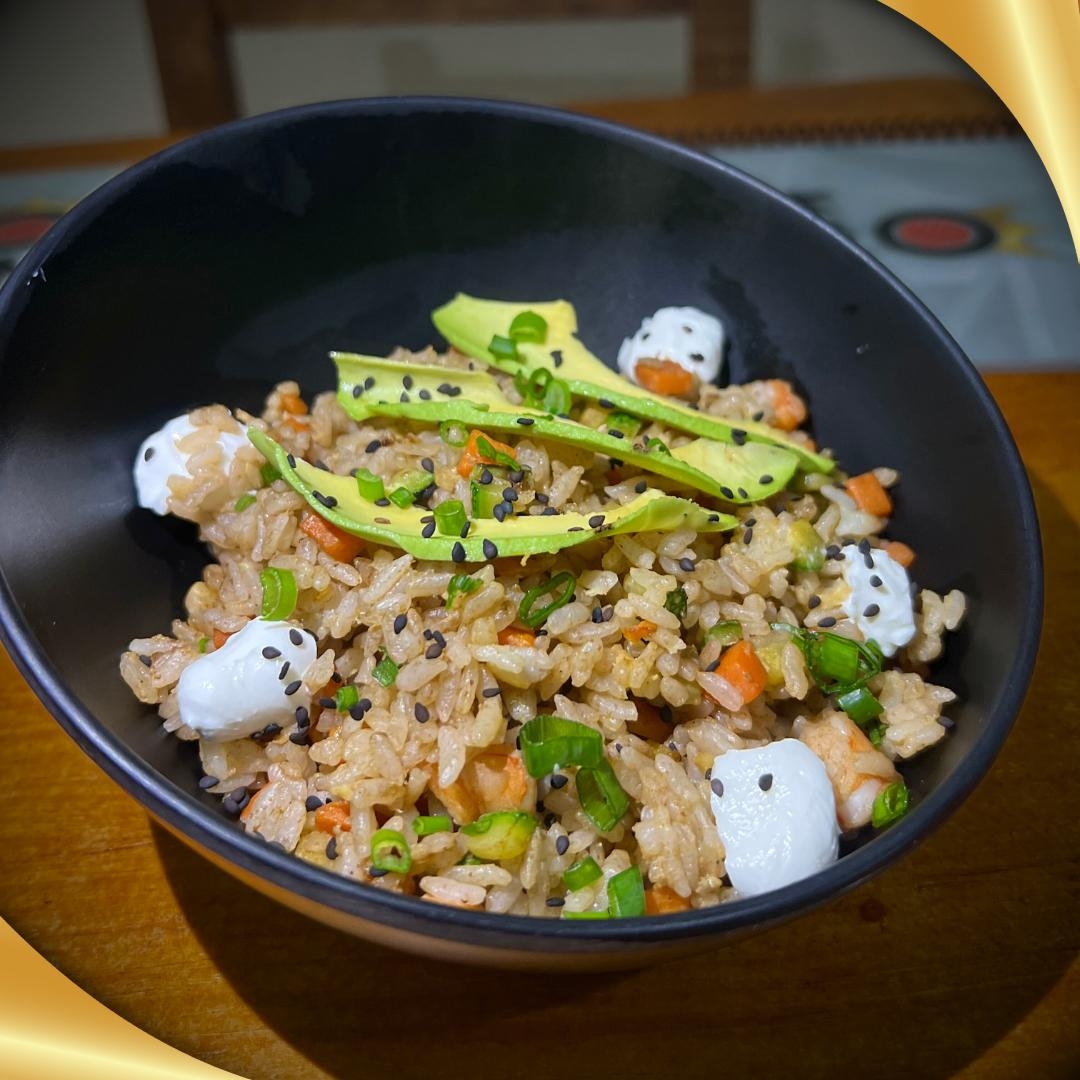 Arroz frito con zanahoria, calabaza, aguacate, philadelphia y camarón
