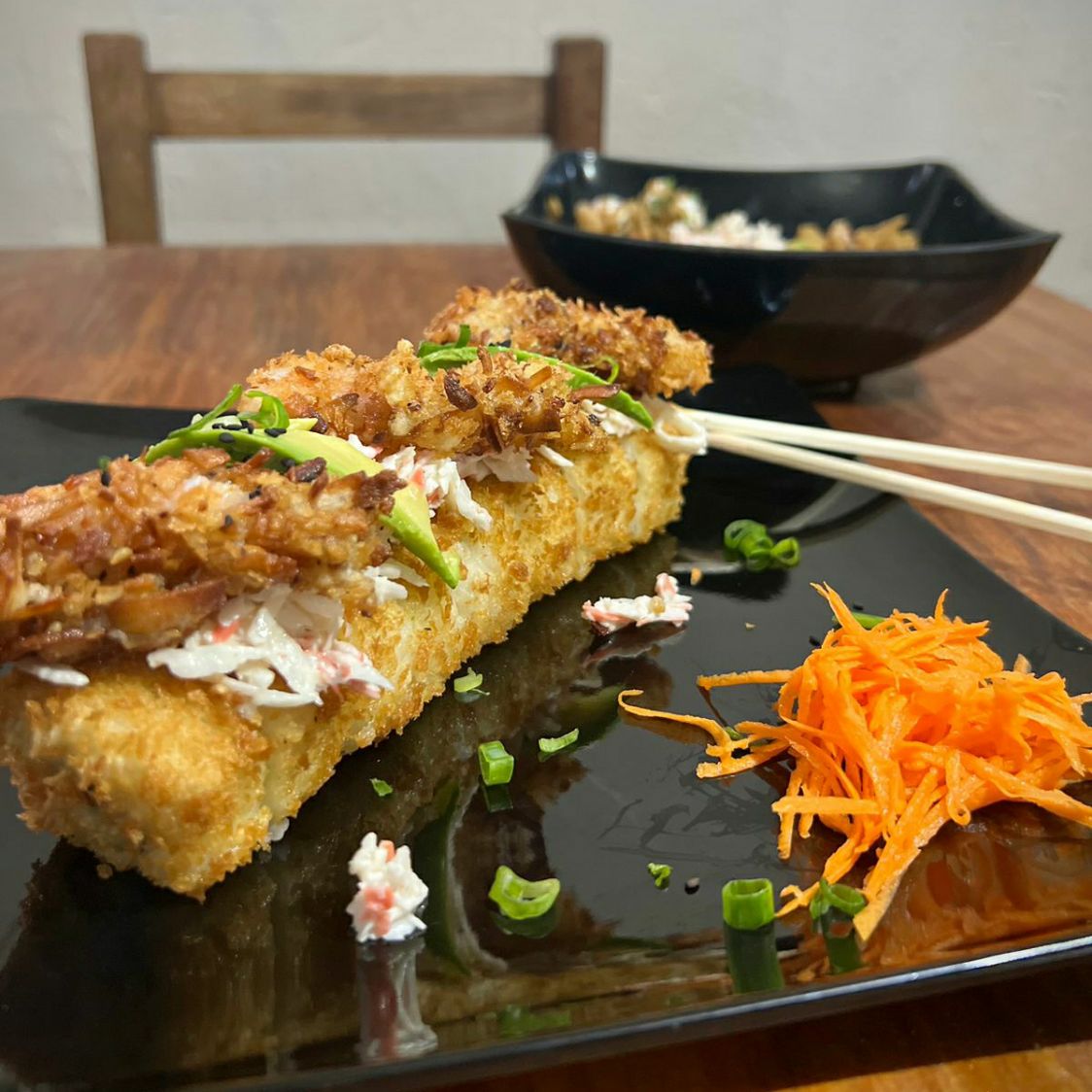 Rollo empanizado 10 piezas, por dentro verdura y camaro,por fuera ensalada tampico, aguacate y camarones al coco