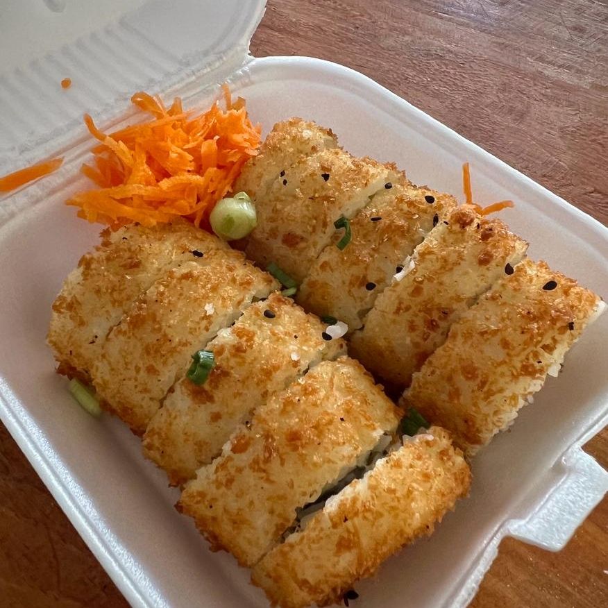 Rollo empanizado 10 piezas, por dentro verdura y Camarón, por fuera ensalada tampico incluye salsa soja y chile con soja (Porcion personal)