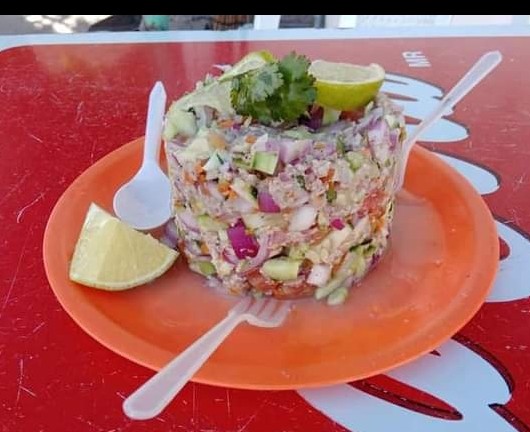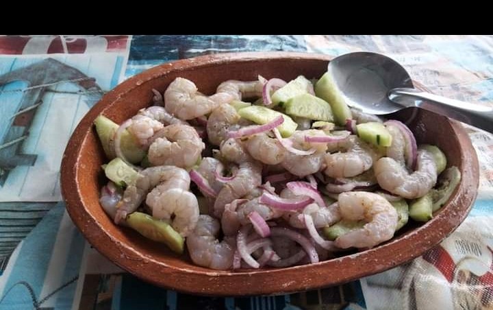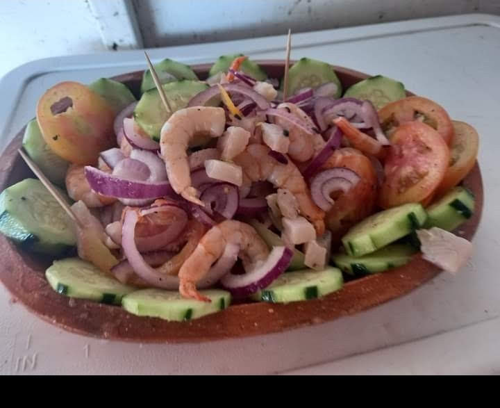 medallón de atún, pulpon , camarón seco y cocido tozeado en cilantro , cebolla y pepino