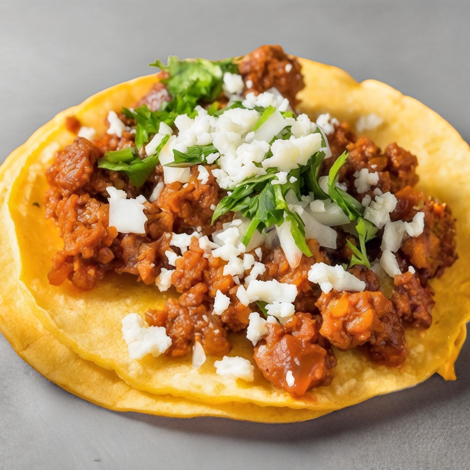 tortilla doble de maiz de 20 cm, con diezmillo picado acompañado de chiles toreados, cebolla guisada y salsas picantes