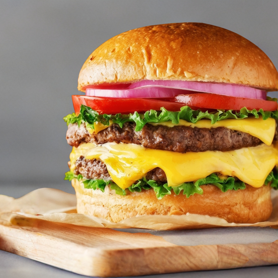 hamburguesa de res con doble porcion de carne y queso amarillo, acompañada de papas fritas