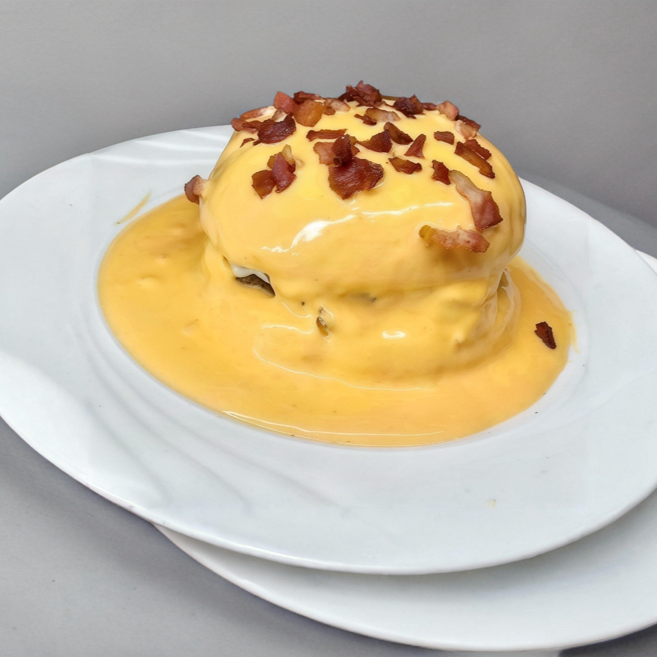 pechuga a la plancha guisada con jamón, gratinada con queso y sazonada con aderezo dulce