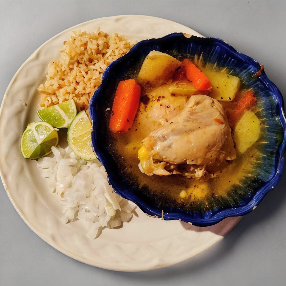 caldo de pollo casero con verduras (papa y zanahoria) acompañado con arroz del día