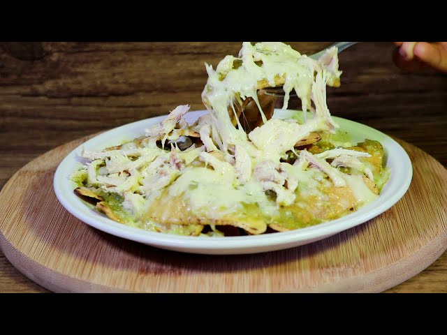 Una genrosa porcion de crujientes totopos bañados en una salsa a tu eleccion, acompañados con frijoles refritos y para finalizar se coronan con crema, queso y pollo a la plancha en trozos.